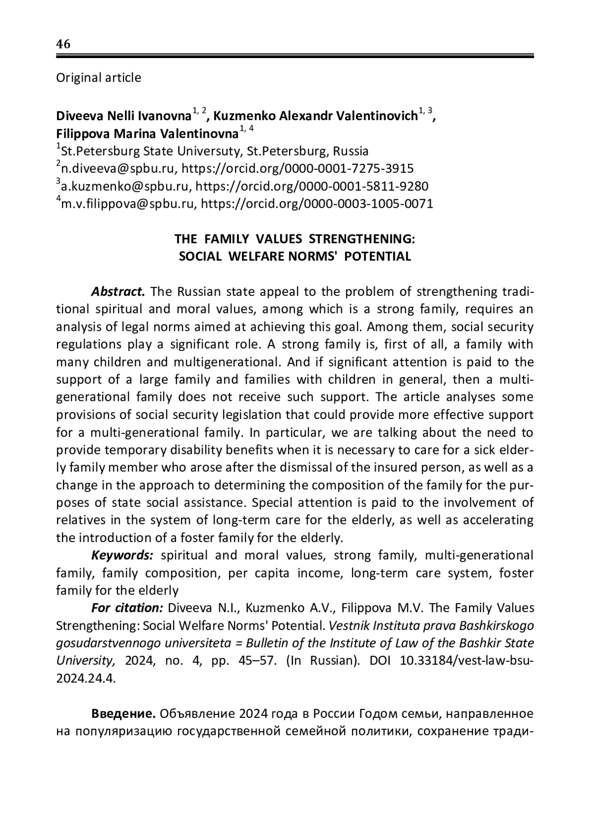 Обращение российского государства к проблеме укрепления традиционных духовно-нравственных ценностей, среди которых названа крепкая семья, требует анализа правовых норм, направленных на достижение этой цели. Среди них немаловажную роль играют нормы о социальном обеспечении. Традиционно для России крепкая семья – это, прежде всего, семья многодетная и многопоколенная. И если поддержке многодетной семьи и в целом семьям с детьми уделяется значительное внимание, то многопоколенная семья такой поддержки не получает. В статье анализируются некоторые положения социально-обеспечительного законодательства, которые могли бы обеспечить более эффективную поддержку многопоколенной семьи. Речь идет, в частности, о необходимости предоставления пособия по временной нетрудоспособности при необходимости ухода за больным пожилым членом семьи, возникшей после увольнения застрахованного лица, а также об изменении подхода к определению состава семьи для целей государственной социальной помощи. Особое внимание в статье уделено вовлечению родственников в систему долговременного ухода за пожилыми лицами, а также ускорению внедрения приемной семьи для пожилых лиц
