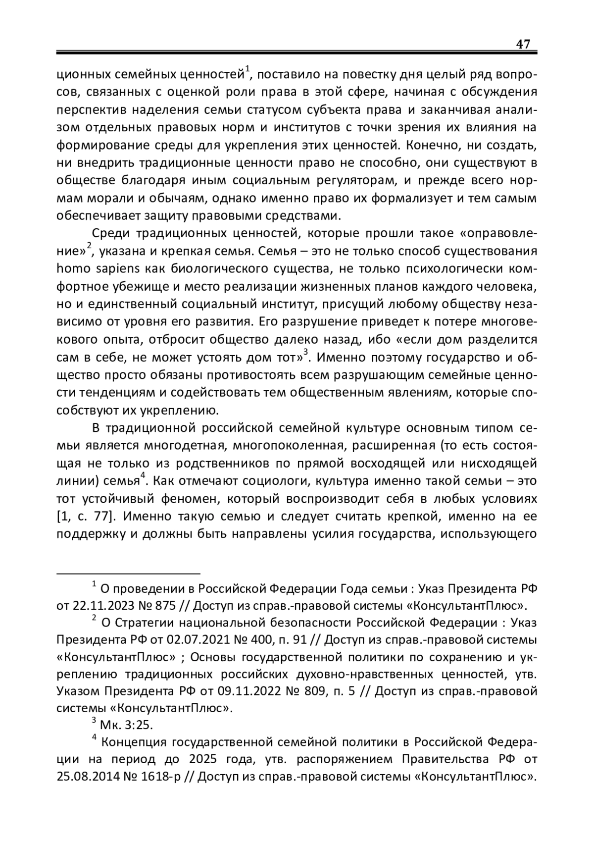 Введение. Объявление 2024 года в России Годом семьи, направленное на популяризацию государственной семейной политики, сохранение традиционных семейных ценностей1, поставило на повестку дня целый ряд вопросов, связанных с оценкой роли права в этой сфере, начиная с обсуждения перспектив наделения семьи статусом субъекта права и заканчивая анализом отдельных правовых норм и институтов с точки зрения их влияния на формирование среды для укрепления этих ценностей. Конечно, ни создать, ни внедрить традиционные ценности право не способно, они существуют в обществе благодаря иным социальным регуляторам, и прежде всего нормам морали и обычаям, однако именно право их формализует и тем самым обеспечивает защиту правовыми средствами