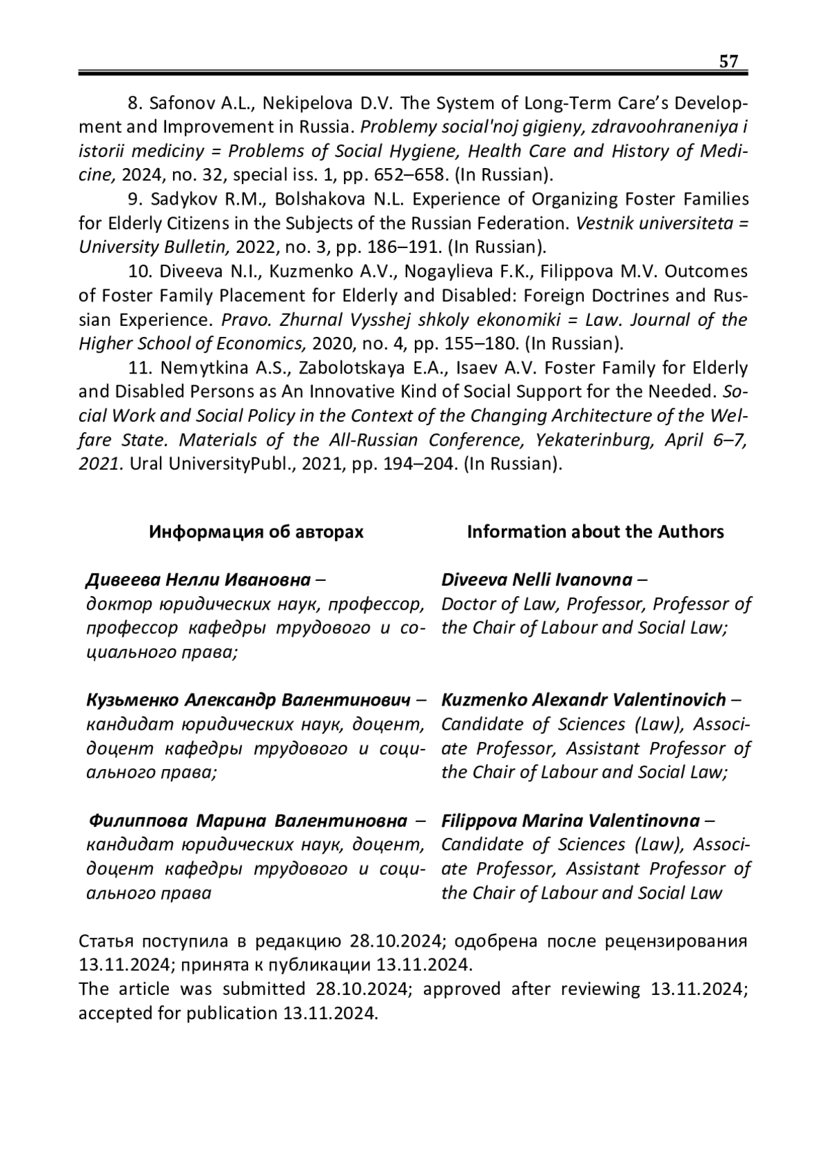 10. Дивеева Н.И. Перспективы института приемной семьи для пожилых граждан и инвалидов: зарубежные доктрины и опыт российского законодателя / Н.И. Дивеева, А.В. Кузьменко, Ф.К. Ногайлиева, М.В. Филиппова // Право. Журнал Высшей школы экономики. - 2020. - № 4. - С. 155-180. EDN: IRZZKH