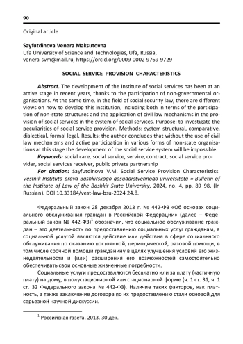 Развитие института социального обслуживания в последние годы находится на активной стадии, в том числе благодаря участию негосударственных организаций. При этом в науке права социального обеспечения существуют разные мнения о путях развития данного института, в том числе как в плане участия негосударственных структур, так и применения гражданскоправовых механизмов при оказании социальной услуги в системе социального обслуживания. Цель: исследование особенностей предоставления социальной услуги. Методы: системно-структурный, сравнительный, диалектический, формально-юридический. Результаты: автор приходит к выводу, что без использования гражданско-правовых механизмов и активного участия в различных формах негосударственных организаций на данном этапе развитие системы социального обслуживания будет невозможно