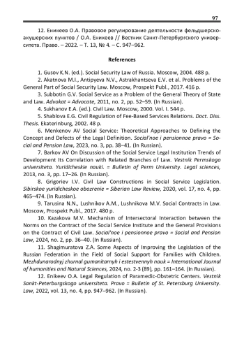 12. Еникеев О.А. Правовое регулирование деятельности фельдшерско-акушерских пунктов / О.А. Еникеев // Вестник Санкт-Петербургского университета. Право. - 2022. - Т. 13, № 4. - С. 947-962. EDN: ALIJCF