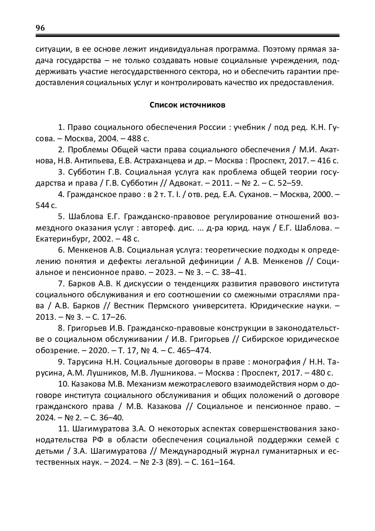 6. Менкенов А.В. Социальная услуга: теоретические подходы к определению понятия и дефекты легальной дефиниции / А.В. Менкенов // Социальное и пенсионное право. - 2023. - № 3. - С. 38-41. EDN: BRGKGX