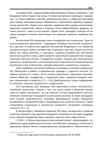 Семья имеет решающее значение для всестороннего роста человека и его самореализации. Это основная ячейка общества, обеспечивающая ценности, убеждения, образ жизни и самовыражение членов семьи. 2024 год объявлен Годом семьи. Президент РФ считает, что «семья – это не просто основа государства и общества, это духовное явление, основа нравственности»1. Крепкая семья определена как одна из традиционных духовно-нравственных ценностей