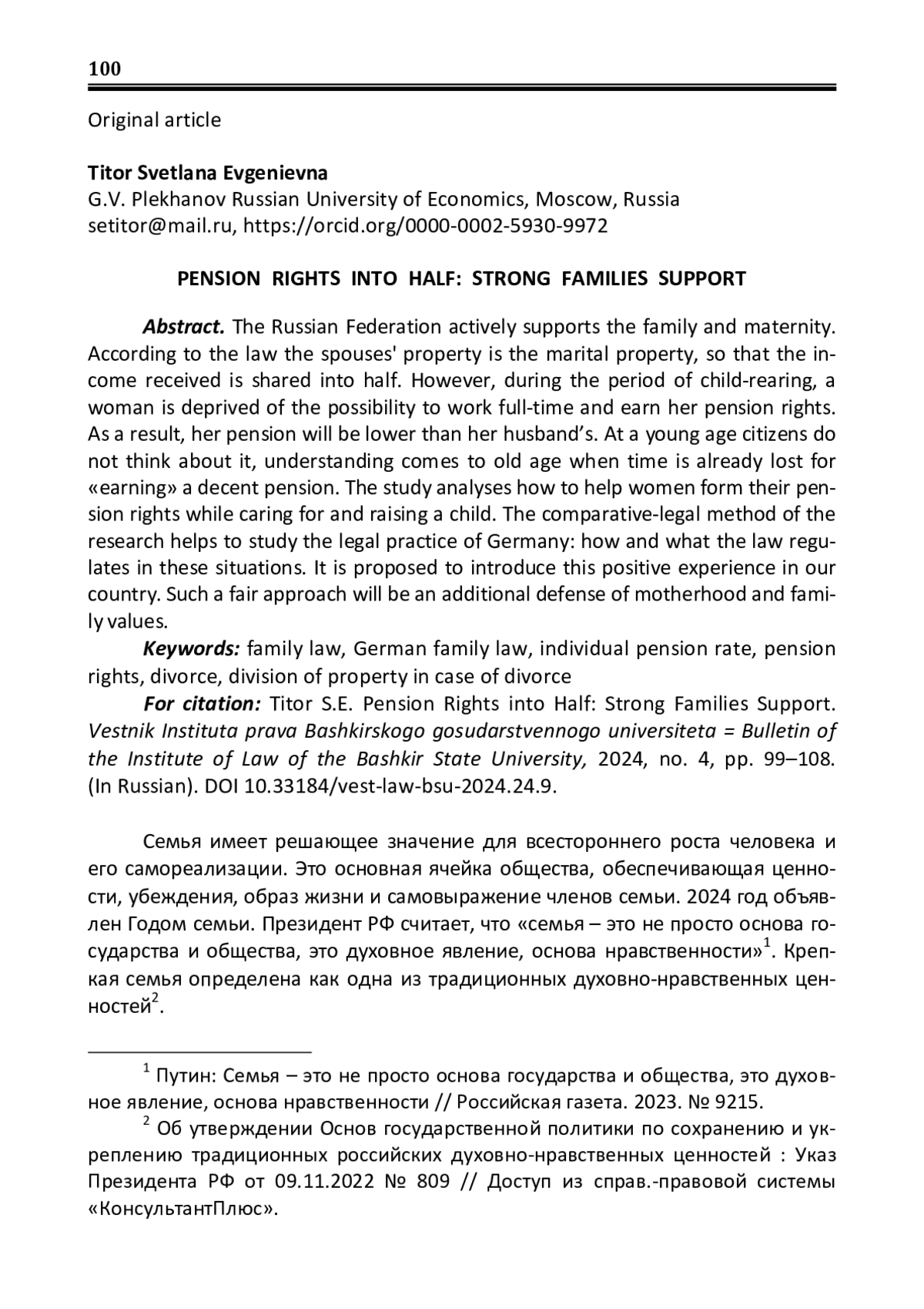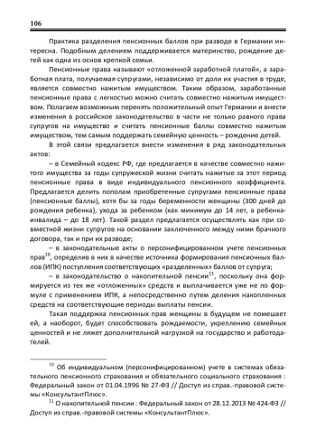 В Российской Федерации активно поддерживаются семья, материнство. Законодательный режим имущества супругов – нажитое имущество, так что получаемые доходы пополам. Однако в период воспитания детей женщина лишена возможности трудиться полноценно и зарабатывать свои пенсионные права. Как результат – ее пенсия будет ниже, чем у ее мужа. В молодом возрасте граждане об этом не задумываются, понимание приходит к старости, когда уже упущено время для «зарабатывания» достойной пенсии. В исследовании проанализировано, как женщине помочь сформировать свои пенсионные права в период ухода и воспитания ребенка. Сравнительно-правовой метод исследования помог изучить правовую практику Германии: как и что в этих ситуациях регламентирует закон. Положительный опыт предлагается внедрить в нашей стране. Такой справедливый подход станет дополнительной защитой материнства, семейных ценностей