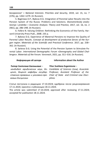 7. Быкова Д.Г. Опыт назначения материнских пенсий в целях повышения качества результатов родительского труда / Д.Г. Быкова // Концепция развития производительных сил Курганской области: материалы научно-практической конференции. - 2017. - С. 258-362. EDN: YKZWJH