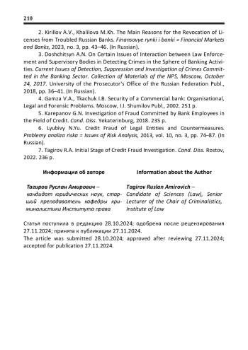 7. Тагиров Р.А. Первоначальный этап расследования мошенничества в сфере кредитования: дис. … канд. юрид. наук / Р.А. Тагиров. - Ростов, 2022. - 236 с. EDN: OYHZGI