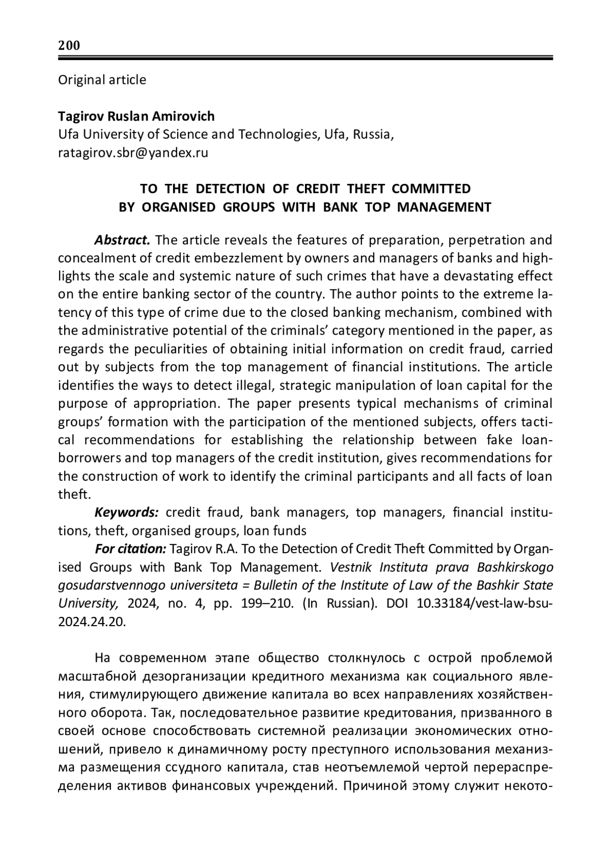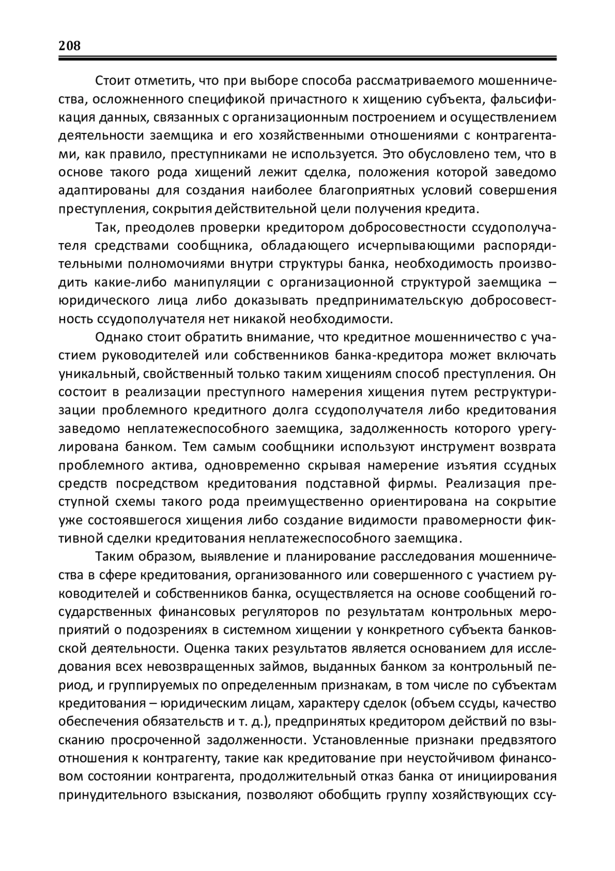 В статье автор раскрывает особенности подготовки, совершения и сокрытия хищения кредитных средств собственниками и руководителями банков, подчеркивая масштабность и системную способность преступлений такого рода к деструктивному воздействию на всю банковскую сферу государства. Обращаясь к особенностям получения первоначальной информации о кредитных мошенничествах, реализуемых субъектами из числа топ-менеджмента финансовых институтов, автор указывает на крайнюю латентность посягательств данного вида, обусловленную закрытостью банковского механизма, сопряженную с административным потенциалом приведенной в работе категории преступников. При этом в статье называются способы выявления противозаконного, стратегического манипулирования ссудным капиталом с целью его присвоения. В работе представлены типичные механизмы формирования преступных групп с участием названных субъектов, предложены тактические рекомендации для установления взаимосвязи между подставными ссудополучателями и топ-менеджерами кредитной организации, даны рекомендации построения работы по выявлению круга соучастников преступления и всех фактов ссудного хищения