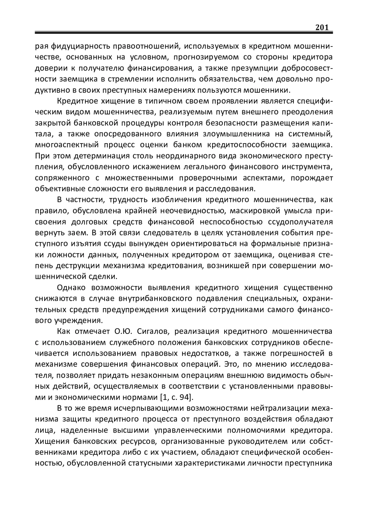 На современном этапе общество столкнулось с острой проблемой масштабной дезорганизации кредитного механизма как социального явления, стимулирующего движение капитала во всех направлениях хозяйственного оборота. Так, последовательное развитие кредитования, призванного в своей основе способствовать системной реализации экономических отношений, привело к динамичному росту преступного использования механизма размещения ссудного капитала, став неотъемлемой чертой перераспределения активов финансовых учреждений