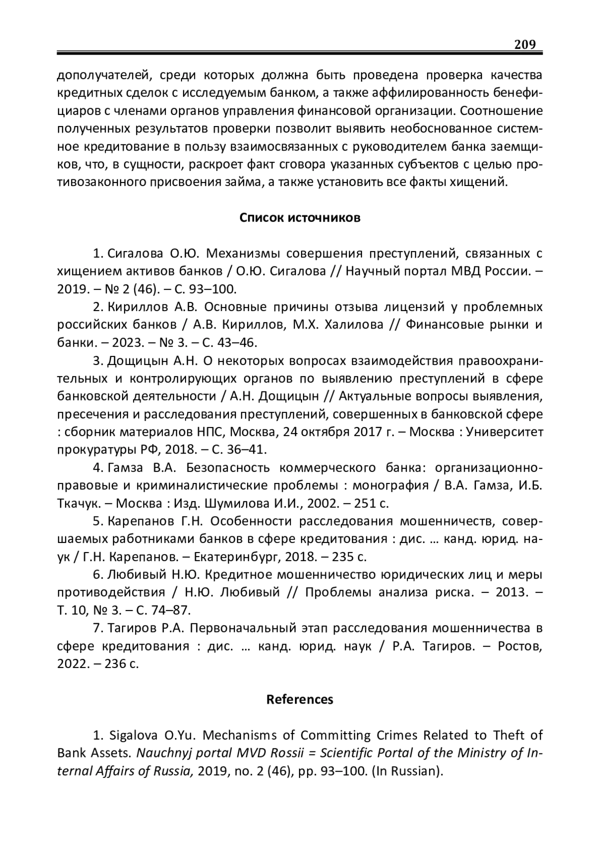 1. Сигалова О.Ю. Механизмы совершения преступлений, связанных с хищением активов банков / О.Ю. Сигалова // Научный портал МВД России. - 2019. - № 2 (46). - С. 93-100. EDN: BCSXWF