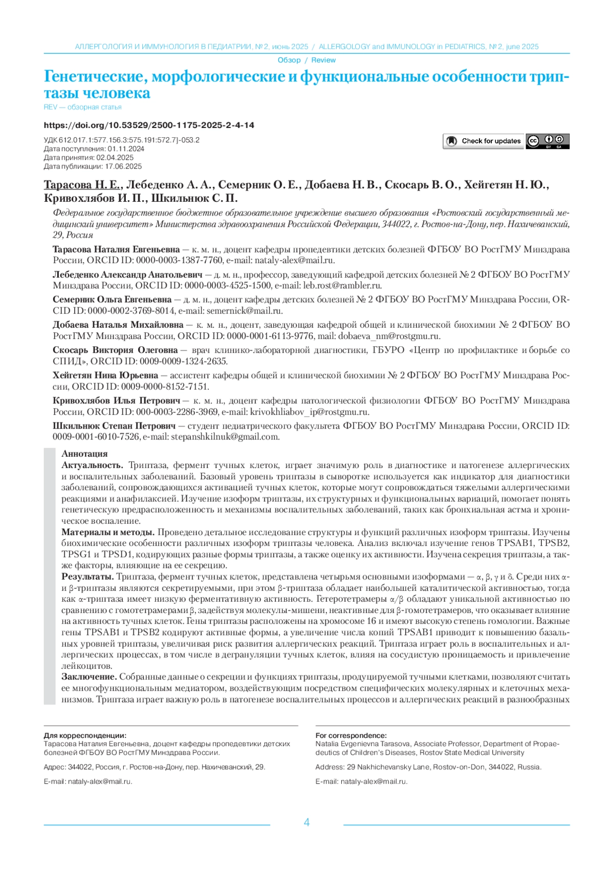 2. Lyons J.J., Tangsheng Y.T. Mast cell tryptases in allergic inflammation and immediate hypersensitivity. Current Opinion in Immunology. 2021; 72: 94-106. DOI: 10.1016/j.coi.2021.04.001
