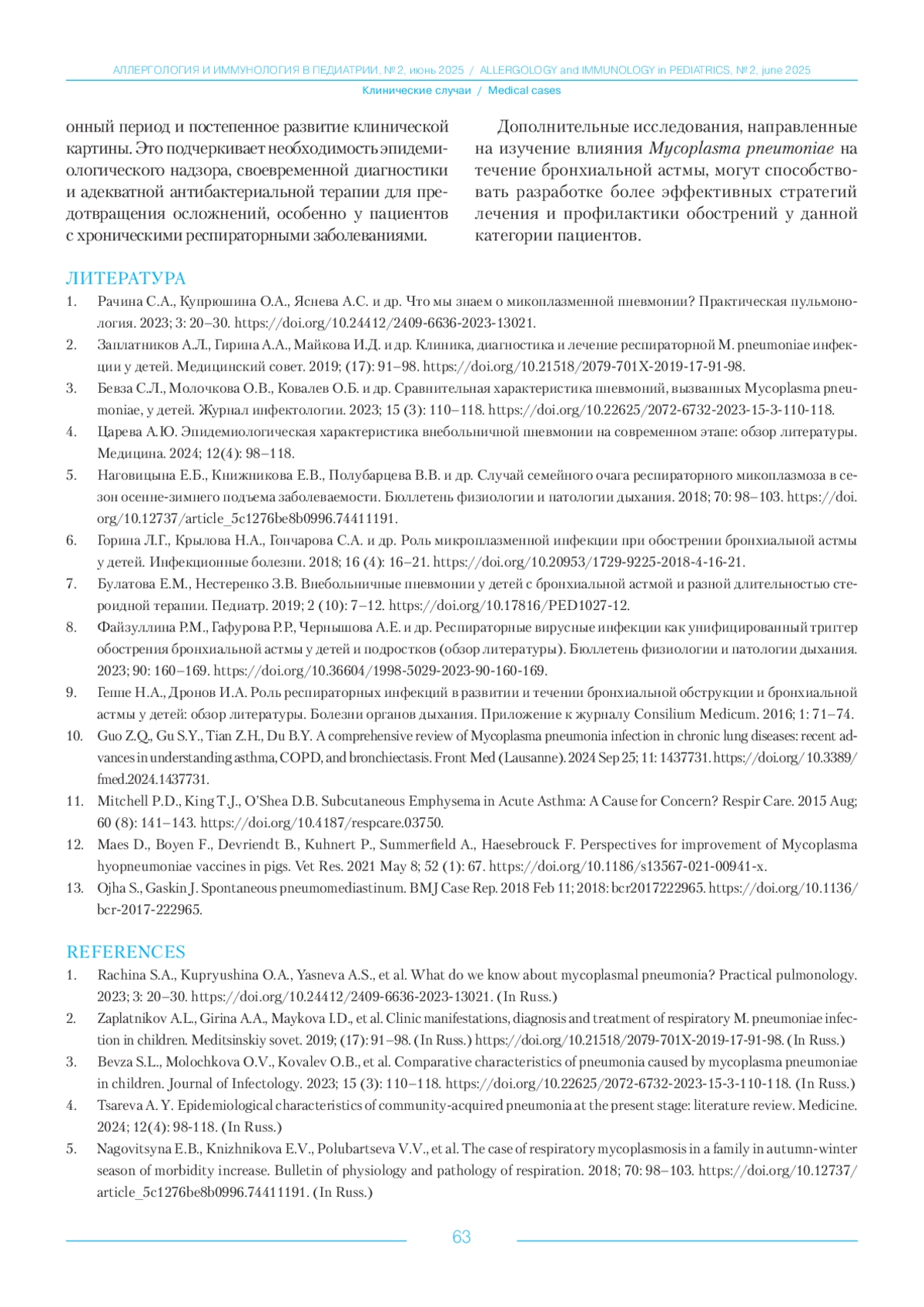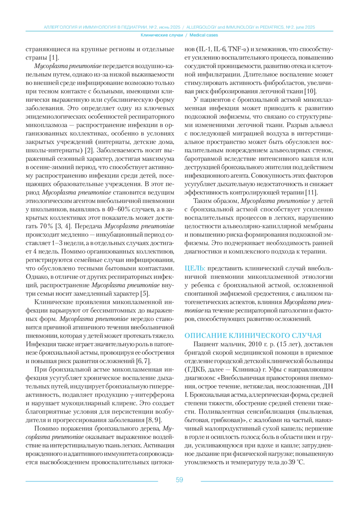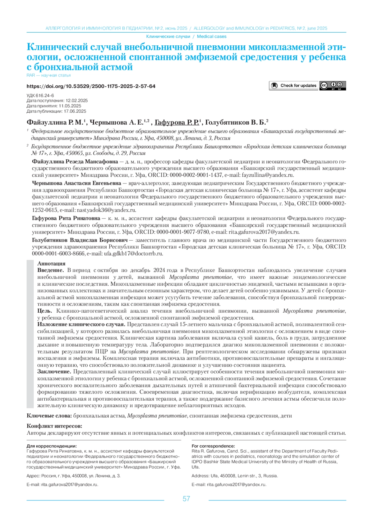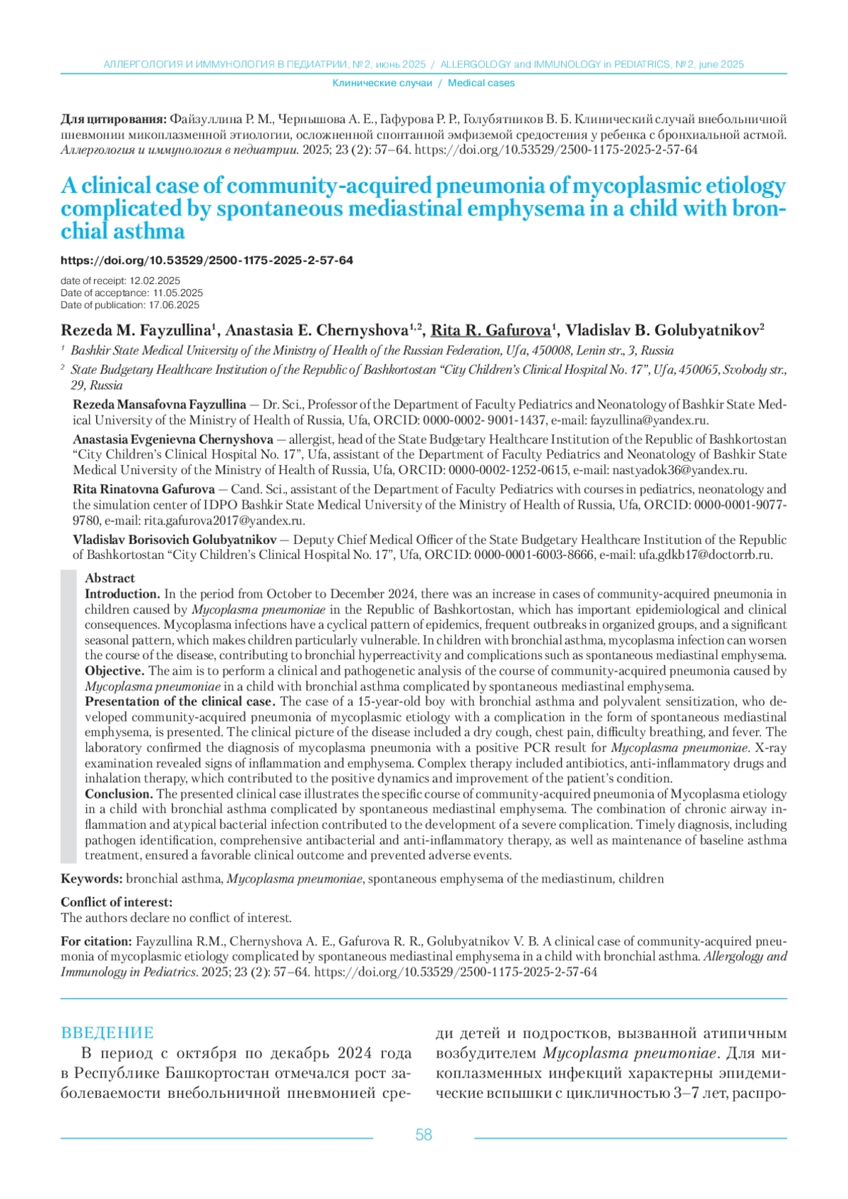 ФАЙЗУЛЛИНА Р. М., ЧЕРНЫШОВА А. Е., ГАФУРОВА Р. Р., ГОЛУБЯТНИКОВ В. Б. КЛИНИЧЕСКИЙ СЛУЧАЙ ВНЕБОЛЬНИЧНОЙ ПНЕВМОНИИ МИКОПЛАЗМЕННОЙ ЭТИОЛОГИИ, ОСЛОЖНЕННОЙ СПОНТАННОЙ ЭМФИЗЕМОЙ СРЕДОСТЕНИЯ У РЕБЕНКА С БРОНХИАЛЬНОЙ АСТМОЙ // АЛЛЕРГОЛОГИЯ И ИММУНОЛОГИЯ В ПЕДИАТРИИ. 2025. № 2, ТОМ 23