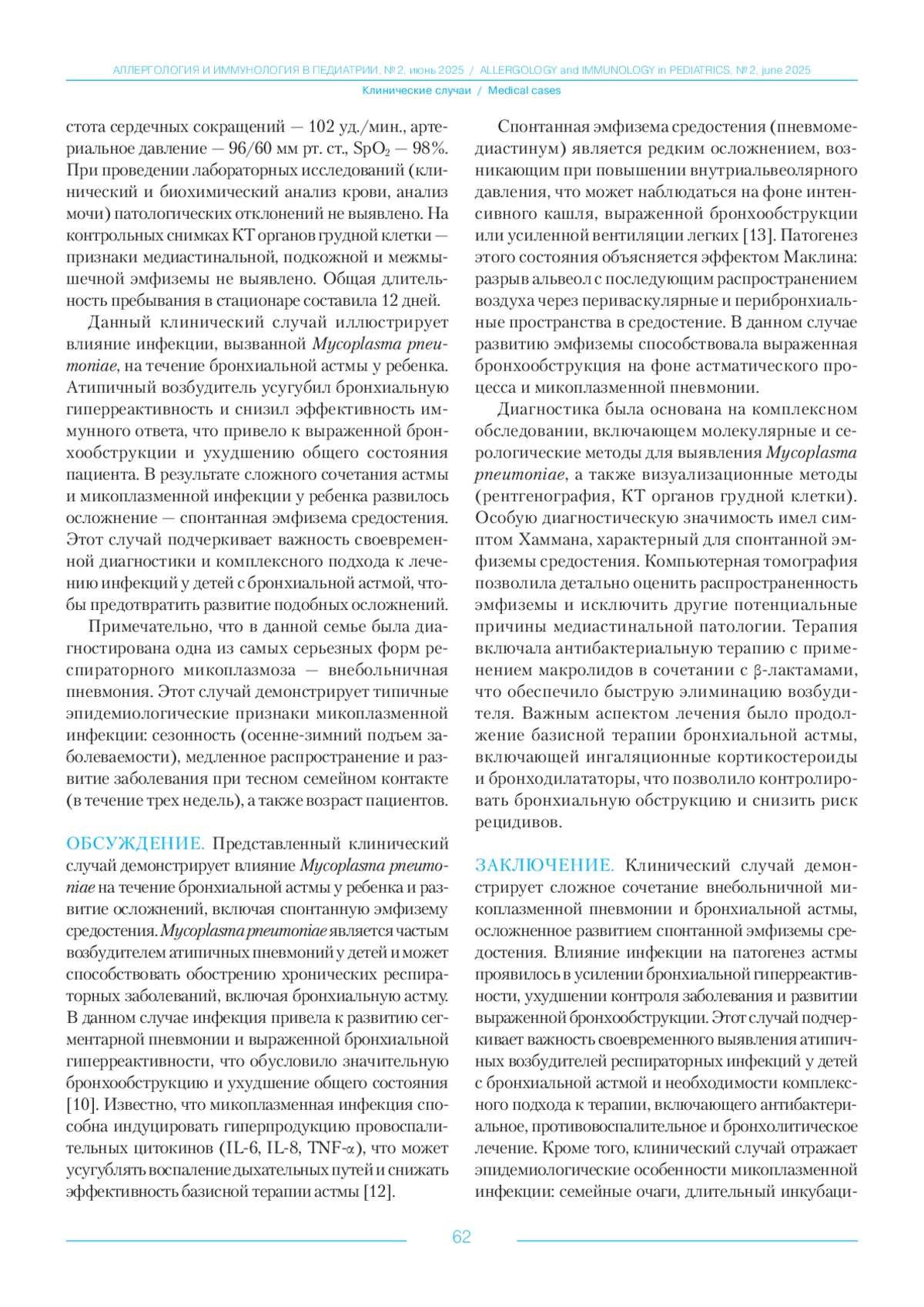 Статья: Клинический случай внебольничной пневмонии микоплазменной этиологии, осложненной спонтанной эмфиземой средостения у ребенка с бронхиальной астмой (2025)