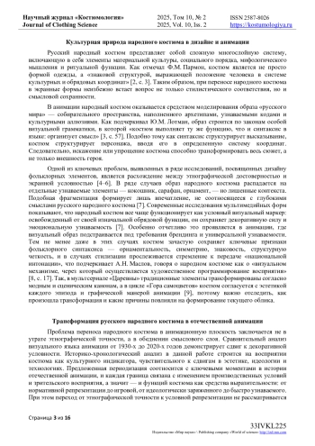 Русский народный костюм в контексте экранной культуры представляет собой не просто часть образа персонажа, но и один из важнейших семиотических компонентов, через который транслируется культурная память, архетип героя и представление о «национальном». В отечественной анимации XX — начала XXI века народный костюм выполнял различные функции: от носителя идеологических установок до объекта декоративной стилизации, от ироничной цитаты до средства культурного кодирования.