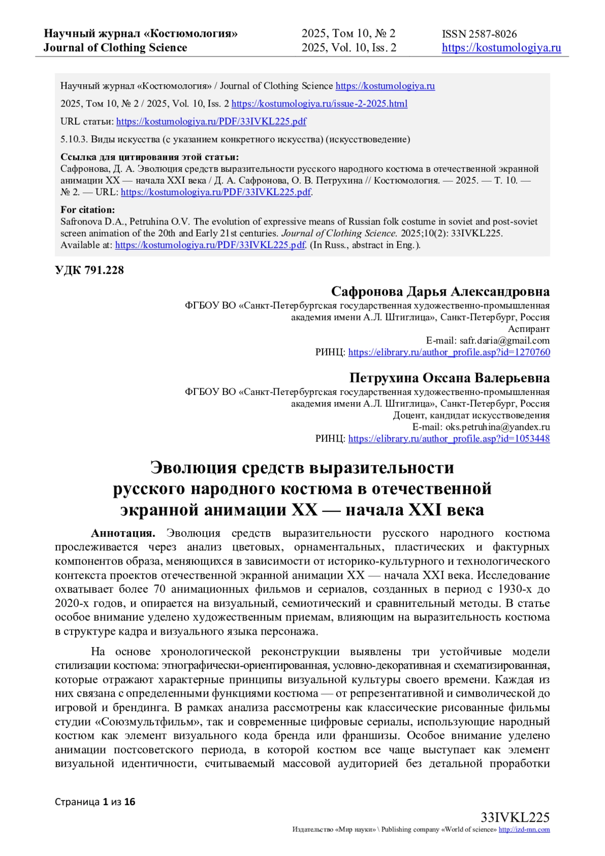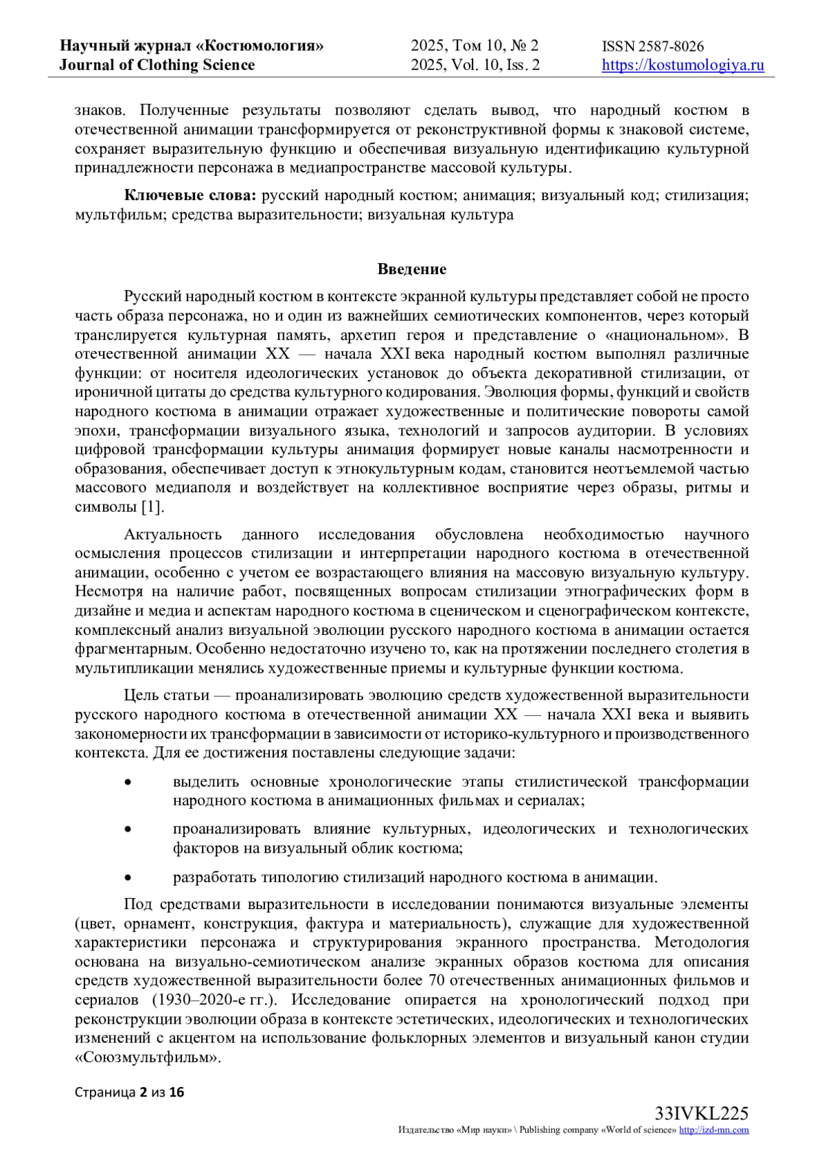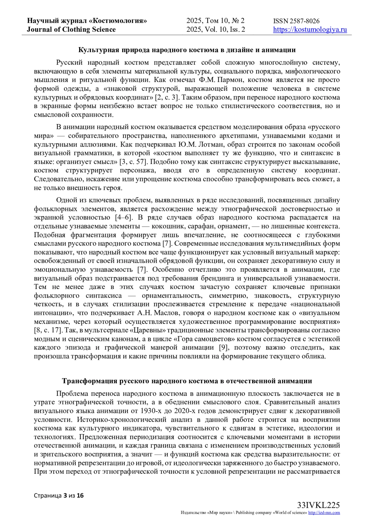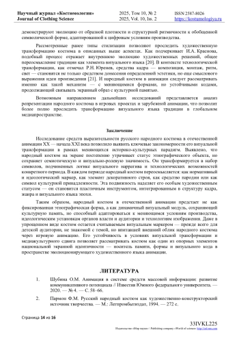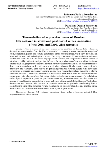 Эволюция средств выразительности русского народного костюма прослеживается через анализ цветовых, орнаментальных, пластических и фактурных компонентов образа, меняющихся в зависимости от историко-культурного и технологического контекста проектов отечественной экранной анимации XX - начала XXI века. Исследование охватывает более 70 анимационных фильмов и сериалов, созданных в период с 1930-х до 2020-х годов, и опирается на визуальный, семиотический и сравнительный методы. В статье особое внимание уделено художественным приемам, влияющим на выразительность костюма в структуре кадра и визуального языка персонажа. На основе хронологической реконструкции выявлены три устойчивые модели стилизации костюма: этнографически-ориентированная, условно-декоративная и схематизированная, которые отражают характерные принципы визуальной культуры своего времени. Каждая из них связана с определенными функциями костюма - от репрезентативной и символической до игровой и брендинга. В рамках анализа рассмотрены как классические рисованные фильмы студии «Союзмультфильм», так и современные цифровые сериалы, использующие народный костюм как элемент визуального кода бренда или франшизы. Особое внимание уделено анимации постсоветского периода, в которой костюм все чаще выступает как элемент визуальной идентичности, считываемый массовой аудиторией без детальной проработки знаков. Полученные результаты позволяют сделать вывод, что народный костюм в отечественной анимации трансформируется от реконструктивной формы к знаковой системе, сохраняет выразительную функцию и обеспечивая визуальную идентификацию культурной принадлежности персонажа в медиапространстве массовой культуры.