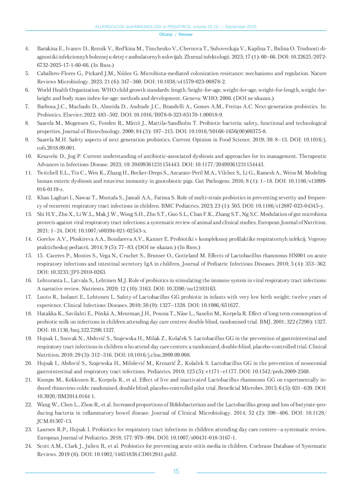 23. Laursen R.P., Hojsak I. Probiotics for respiratory tract infections in children attending day care centers-a systematic review. European Journal of Pediatrics. 2018; 177: 979-994. DOI: 10.1007/s00431-018-3167-1