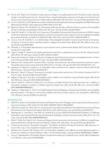 22. Li K., Gechong R., Shuang L. et al. Eosinophilic gastroenteritis: pathogenesis, diagnosis, and treatment. Chin Med J (Engl). 2023; 136 (8): 899-909. DOI: 10.1097/CM9.000000000000002511