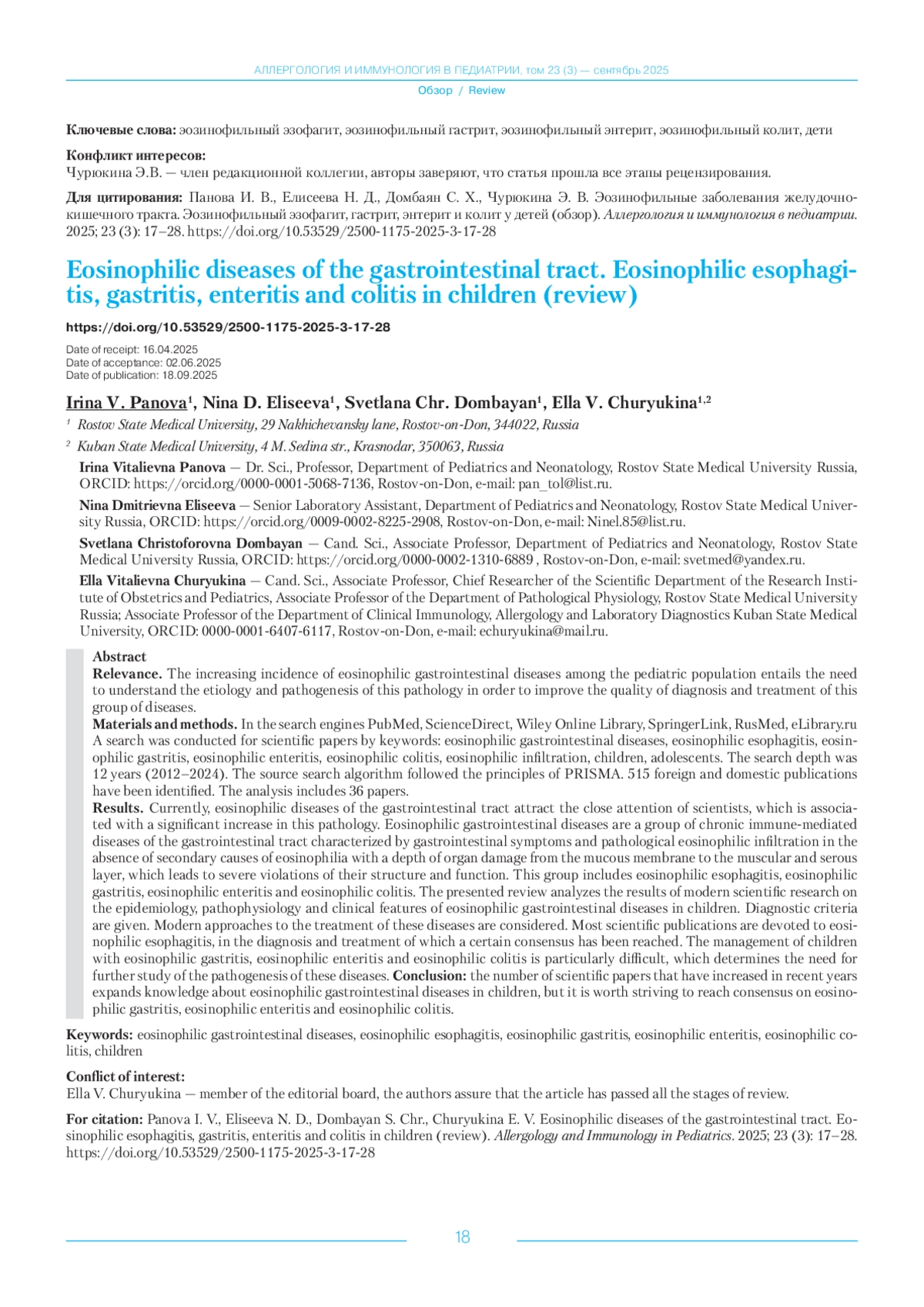 Актуальность. Рост заболеваемости эозинофильными гастроинтестинальными болезнями среди детского населения влечет за собой необходимость понимания этиологии и патогенеза данной патологии с целью повышения качества диагностики и лечения этой группы болезней.