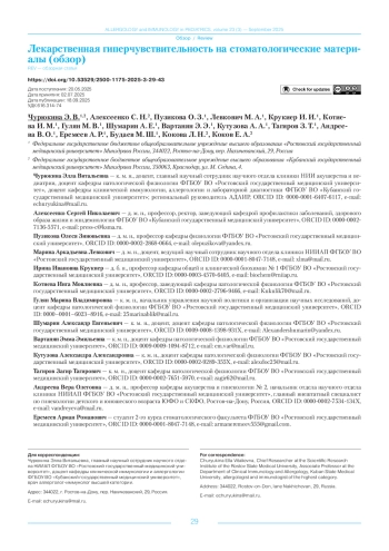 Результаты. Среди стоматологических материалов наиболее распространенными химическими компонентами, которые могут вызывать лекарственную гиперчувствительность, являются металлы и полимеры. Лекарственная гиперчувствительность на стоматологические материалы могут проявляться в виде немедленных реакций гиперчувствительности (типа I) на металлы, латекс и некоторые полимеры с клиническими проявлениями в виде крапивницы, ангионевротического отека, бронхоспазма и анафилаксии либо замедленных реакций гиперчувствительности, чаще к металлам с симптомами контактного аллергического дерматита. Стоматологические материалы, имеющие проблемы с биосовместимостью, включают композиты, латексные перчатки, местные анестетики, эндодонтические материалы, слепочные материалы и металлы.
