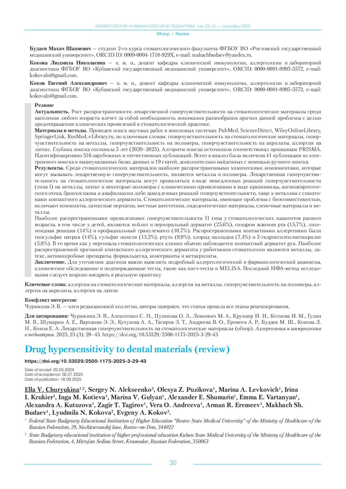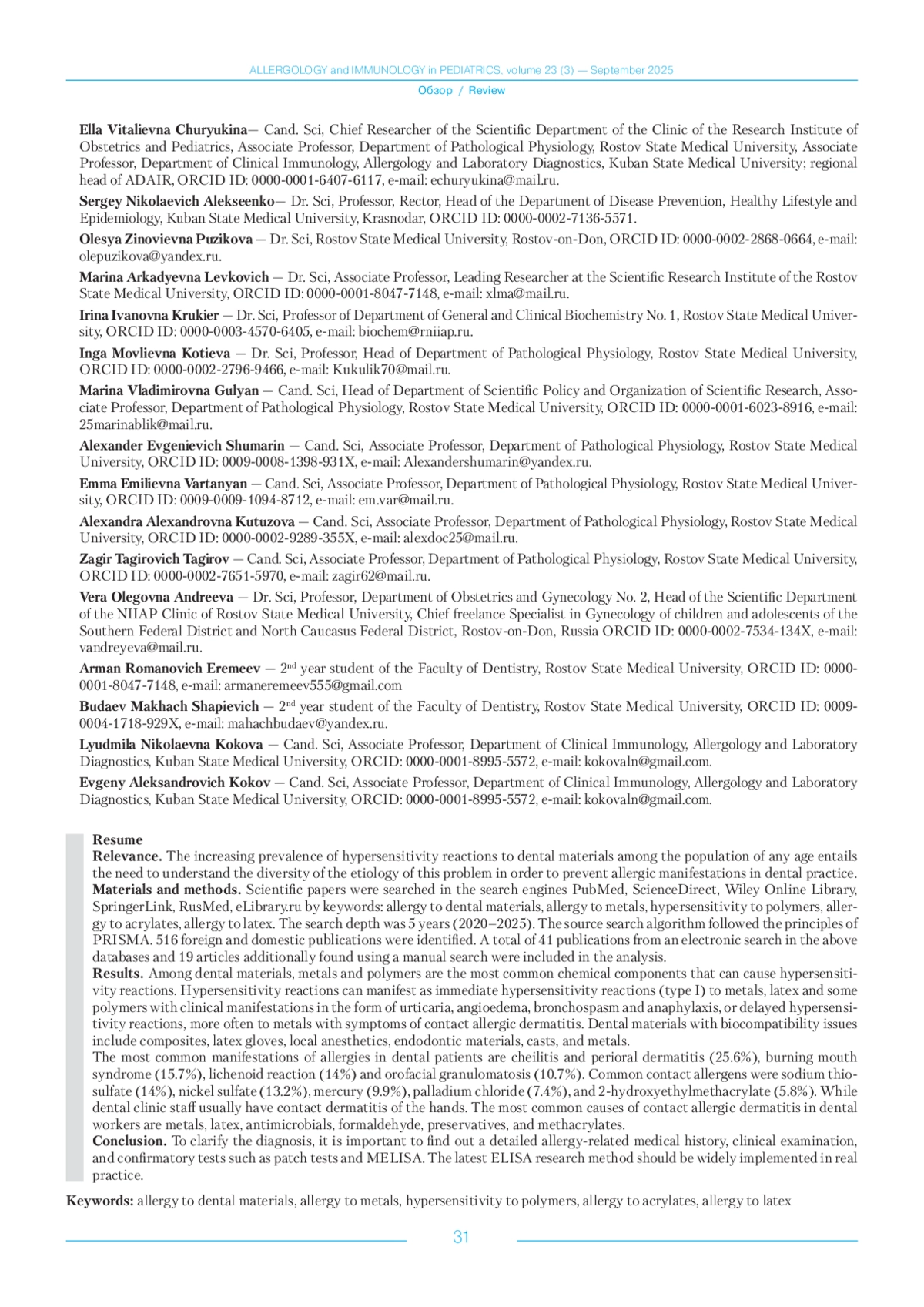 Материалы и методы. Проведен поиск научных работ в поисковых системах PubMed, ScienceDirect, WileyOnlineLibrary, SpringerLink, RusMed, eLibrary. ru, по ключевым словам: гиперчувствительность на стоматологические материалы, гиперчувствительность на металлы, гиперчувствительность на полимеры, гиперчувствительность на акрилаты, аллергия на латекс. Глубина поиска составила 5 лет (2020–2025). Алгоритм поиска источников соответствовал принципам PRISMA. Идентифицировано 516 зарубежных и отечественных публикаций. Всего в анализ была включена 41 публикация из электронного поиска в вышеуказанных базах данных и 19 статей, дополнительно найденных с помощью ручного поиска.