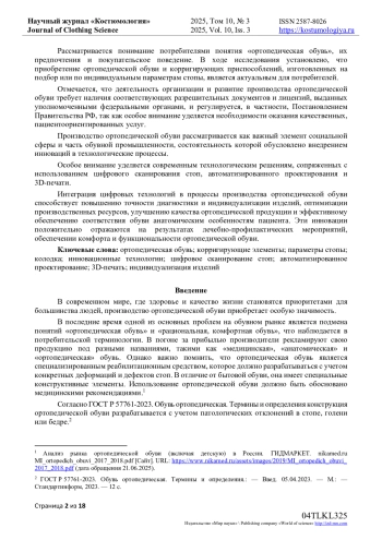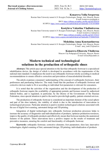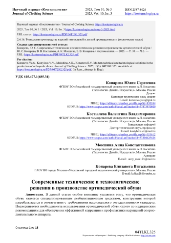В данной статье особое внимание уделяется тому, что ортопедическая обувь является специализированным реабилитационным средством, конструкция которой разрабатывается в соответствии с требованиями национального государственного стандарта. Подчеркивается необходимость использования ортопедической обуви строго по медицинским рекомендациям для обеспечения эффективной коррекции и профилактики нарушений опорно-двигательного аппарата. Рассматривается понимание потребителями понятия «ортопедическая обувь», их предпочтения и покупательское поведение. В ходе исследования установлено, что приобретение ортопедической обуви и корригирующих приспособлений, изготовленных на подбор или по индивидуальным параметрам стопы, является актуальным для потребителей. Отмечается, что деятельность организации и развитие производства ортопедической обуви требует наличия соответствующих разрешительных документов и лицензий, выданных уполномоченными федеральными органами, и регулируется, в частности, Постановлением Правительства РФ, так как особое внимание уделяется необходимости оказания качественных, пациентоориентированных услуг. Производство ортопедической обуви рассматривается как важный элемент социальной сферы и часть обувной промышленности, состоятельность которой обусловлено внедрением инноваций в технологические процессы. Особое внимание уделяется современным технологическим решениям, сопряженных с использованием цифрового сканирования стоп, автоматизированного проектирования и 3D-печати. Интеграция цифровых технологий в процессы производства ортопедической обуви способствует повышению точности диагностики и индивидуализации изделий, оптимизации производственных ресурсов, улучшению качества ортопедической продукции и эффективному обеспечению соответствия обуви анатомическим особенностям пациента. Эти инновации положительно отражаются на результатах лечебно-профилактических мероприятий, обеспечении комфорта и функциональности ортопедической обуви.