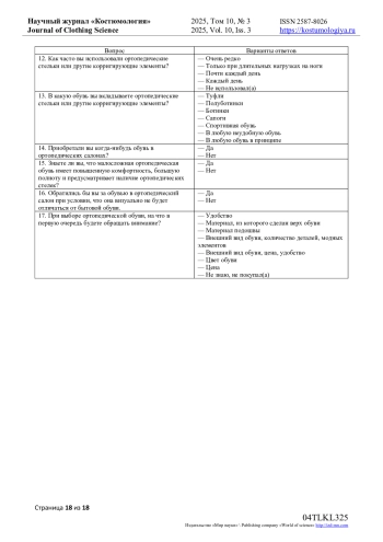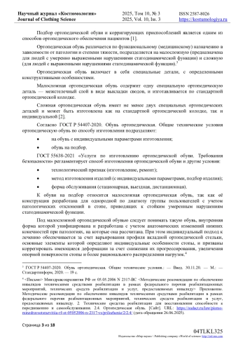 8. Ермакова, Е.О. Оптимизация ортопедического обеспечения пациентов на основе автоматизированного подбора обуви и принципов кастомизации / Е.О. Ермакова, С.Ю. Киселев, Е.Е. Смирнов - // Костюмология. - 2021. - Т. 6, № 4. - URL: https://kostumologiya.ru/PDF/01TLKL421.pdf. DOI: 10.15862/01TLKL421 EDN: PTSMDT