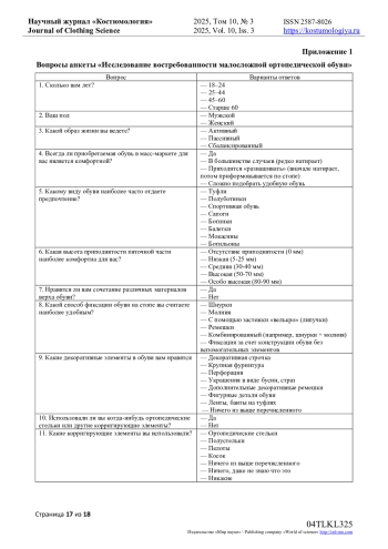 Цель исследования состоит в сборе и последующем анализе данных, позволяющих выявить реальные ожидания потребителей перед началом зимнего сезона 2025/26 годов. Научная работа проводилась в рамках изучения меха как материала, широко используемого отечественными производителями модной одежды различного ассортимента и назначения. Мех («мягкое золото») традиционно считается уникальным природным богатством России. В XVI веке он служил символом высокого статуса в российском обществе, олицетворяя богатство и процветание. Дорогостоящие соболиные меха были неотъемлемой частью древнерусских свадебных церемоний. Исследование основано на социальном опросе - анкете, направленной на выявление потребительских предпочтений относительно выбора верхней зимней одежды из меха. Опрос-анкетирование составлено автором и включает 18 вопросов. В анкетировании принимали участие жители Москвы, в том числе обучающаяся молодежь творческих специальностей: художники, дизайнеры (приложение 1). В ходе исследования были поставлены следующие задачи: выявить актуальность использования меха в производстве верхней одежды. Определить предпочтения потребителей относительно ассортимента верхней одежды. установить предпочтения в выборе между искусственным и натуральным мехом. Изучить предпочтения покупателей по видам меховых полуфабрикатов, способам их декорирования, длине, цветовой гамме, стилю, применению инновационных материалов, декоративных элементов и фурнитуры. Эти данные необходимы для формирования основополагающих характеристик, позволяющих дизайнерам разрабатывать качественные и востребованные продукты. Современные инновационные технологии обеспечивают создание высококачественного мехового сырья. Анализ эстетической привлекательности меха и изучение потребительских предпочтений позволят проектировать конкурентоспособную верхнюю одежду и создавать оригинальные дизайнерские коллекции.