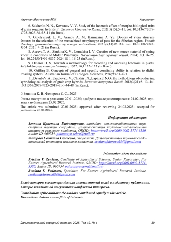 8. Асеева Т. А., Зенкина К. В., Ломакина И. В. Создание нового исходного материала яровой пшеницы в условиях Среднего Приамурья // Дальневосточный аграрный вестник. 2024. Т. 18. № 1. С. 16-25. DOI: 10.22450/1999-6837-2024-18-1-16-25 EDN: WGGNDW