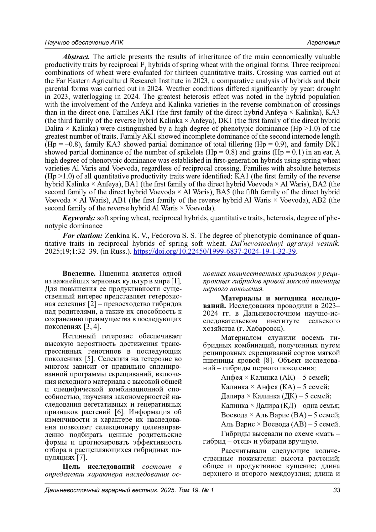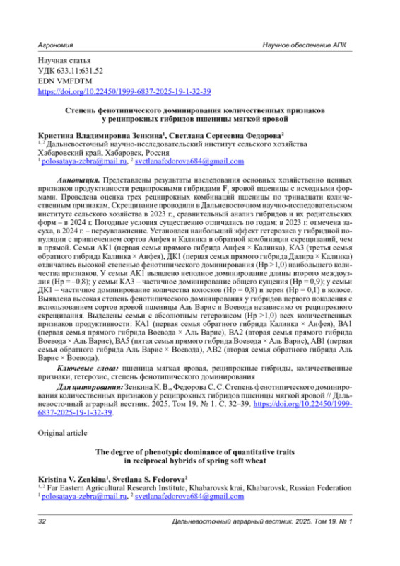 Представлены результаты наследования основных хозяйственно ценных признаков продуктивности реципрокными гибридами F1 яровой пшеницы с исходными формами. Проведена оценка трех реципрокных комбинаций пшеницы по тринадцати количественным признакам. Скрещивание проводили в Дальневосточном научно-исследовательском институте сельского хозяйства в 2023 г., сравнительный анализ гибридов и их родительских форм - в 2024 г. Погодные условия существенно отличались по годам: в 2023 г. отмечена засуха, в 2024 г. - переувлажнение. Установлен наибольший эффект гетерозиса у гибридной популяции с привлечением сортов Анфея и Калинка в обратной комбинации скрещиваний, чем в прямой. Семьи АК1 (первая семья прямого гибрида Анфея х Калинка), КА3 (третья семья обратного гибрида Калинка х Анфея), ДК1 (первая семья прямого гибрида Далира х Калинка) отличались высокой степенью фенотипического доминирования (Нр >1,0) наибольшего количества признаков. У семьи АК1 выявлено неполное доминирование длины второго междоузлия (Hp = -0,8); у семьи КА3 - частичное доминирование общего кущения (Нр = 0,9); у семьи ДК1 - частичное доминирование количества колосков (Нр = 0,8) и зерен (Нр = 0,1) в колосе. Выявлена высокая степень фенотипического доминирования у гибридов первого поколения с использованием сортов яровой пшеницы Аль Варис и Воевода независимо от реципрокного скрещивания. Выделены семьи с абсолютным гетерозисом (Нр >1,0) всех количественных признаков продуктивности: КА1 (первая семья обратного гибрида Калинка х Анфея), ВА1 (первая семья прямого гибрида Воевода х Аль Варис), ВА2 (вторая семья прямого гибрида Воевода х Аль Варис), ВА5 (пятая семья прямого гибрида Воевода х Аль Варис), АВ1 (первая семья обратного гибрида Аль Варис х Воевода), АВ2 (вторая семья обратного гибрида Аль Варис х Воевода)