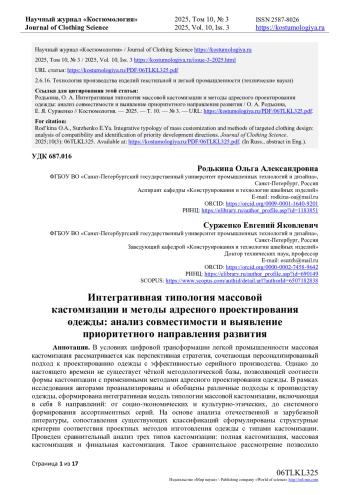 32. Возьмилова, А.А. Классификация методов модульного проектирования одежды / А.А. Возьмилова, Г.И. Петушкова // Костюмология. - 2020. - Т. 5, № 4. - С. 3. EDN: LFNEXL