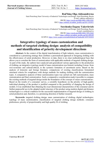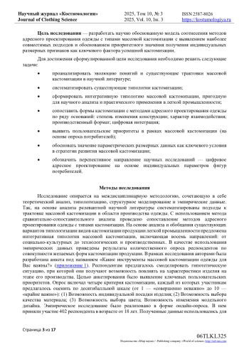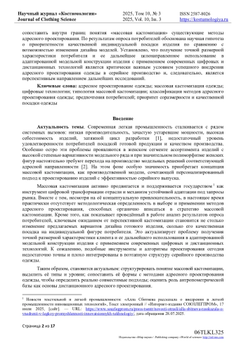 В условиях цифровой трансформации легкой промышленности массовая кастомизация рассматривается как перспективная стратегия, сочетающая персонализированный подход к проектированию одежды с эффективностью серийного производства. Однако до настоящего времени не существует чёткой методологической базы, позволяющей соотнести формы кастомизации с применимыми методами адресного проектирования одежды. В рамках исследования авторами проанализированы и обобщены различные подходы к производству одежды, сформирована интегративная модель типологии массовой кастомизации, включающая в себя 8 направлений: от социо-экономических и культурно-этических, до системного формирования ассортиментных серий. На основе анализа отечественной и зарубежной литературы, сопоставления существующих классификаций сформулированы структурные критерии соответствия проектных методов изготовления одежды с типами кастомизации. Проведен сравнительный анализ трех типов кастомизации: полная кастомизация, массовая кастомизация и финальная кастомизация. Такое сравнительное рассмотрение позволило сопоставить внутри границ понятия «массовая кастомизация» существующие методы адресного проектирования. По результатам опроса потребителей обоснована научная гипотеза о приоритетности качественной индивидуальной посадки изделия по сравнению с возможностью изменения дизайна моделей. Установлено, что получение точной размерной характеристики потребителя и ее дальнейшее целенаправленное использование в адаптированной модельной конструкции изделия с применением современных цифровых и дистанционных технологий является критически важным условием успешного внедрения адресного проектирования одежды в серийное производство и, следовательно, является перспективным направлением дальнейших исследований.