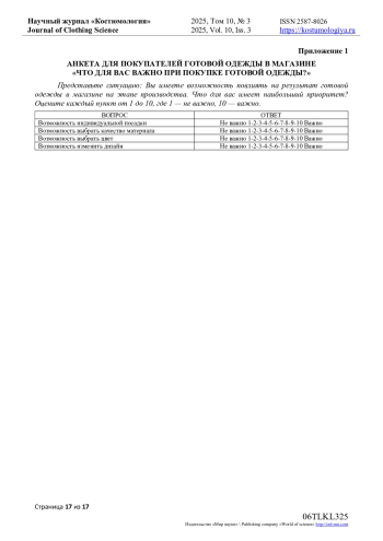 Цель исследования состоит в сборе и последующем анализе данных, позволяющих выявить реальные ожидания потребителей перед началом зимнего сезона 2025/26 годов. Научная работа проводилась в рамках изучения меха как материала, широко используемого отечественными производителями модной одежды различного ассортимента и назначения. Мех («мягкое золото») традиционно считается уникальным природным богатством России. В XVI веке он служил символом высокого статуса в российском обществе, олицетворяя богатство и процветание. Дорогостоящие соболиные меха были неотъемлемой частью древнерусских свадебных церемоний. Исследование основано на социальном опросе - анкете, направленной на выявление потребительских предпочтений относительно выбора верхней зимней одежды из меха. Опрос-анкетирование составлено автором и включает 18 вопросов. В анкетировании принимали участие жители Москвы, в том числе обучающаяся молодежь творческих специальностей: художники, дизайнеры (приложение 1). В ходе исследования были поставлены следующие задачи: выявить актуальность использования меха в производстве верхней одежды. Определить предпочтения потребителей относительно ассортимента верхней одежды. установить предпочтения в выборе между искусственным и натуральным мехом. Изучить предпочтения покупателей по видам меховых полуфабрикатов, способам их декорирования, длине, цветовой гамме, стилю, применению инновационных материалов, декоративных элементов и фурнитуры. Эти данные необходимы для формирования основополагающих характеристик, позволяющих дизайнерам разрабатывать качественные и востребованные продукты. Современные инновационные технологии обеспечивают создание высококачественного мехового сырья. Анализ эстетической привлекательности меха и изучение потребительских предпочтений позволят проектировать конкурентоспособную верхнюю одежду и создавать оригинальные дизайнерские коллекции.