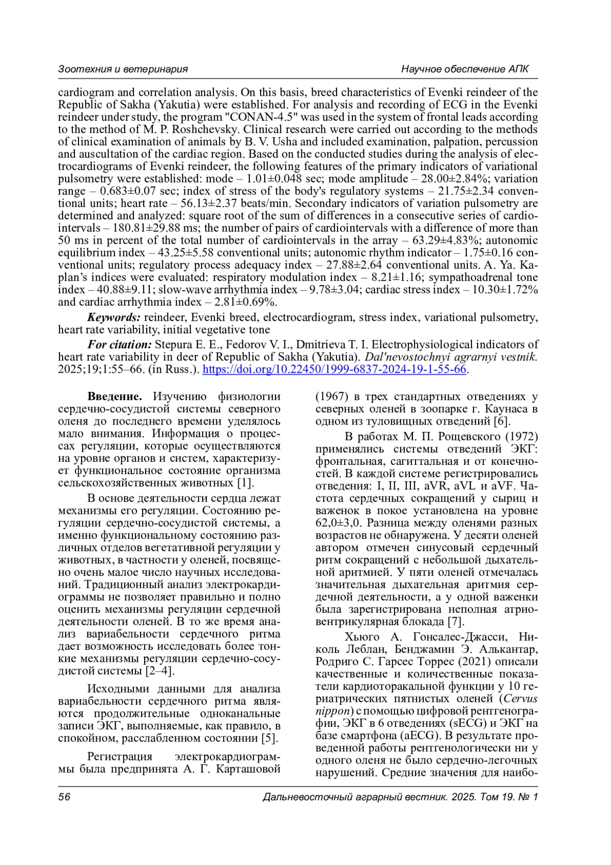 В статье представлены оригинальные исследования и впервые проведен анализ вариационных пульсограмм методом математического анализа вариабельности сердечного ритма электрокардиограммы, а также выполнен корреляционный анализ, что позволило установить породные особенности оленей эвенкийской породы Республики Саха (Якутия). Для анализа и снятия ЭКГ у исследуемых оленей использовали программу «CONAN-4.5» в системе фронтальных отведений по методике М. П. Рощевского. Клинические исследования проводились по методикам клинического осмотра животных Б. В. Уша и включали осмотр, пальпацию, перкуссию и аускультацию сердечной области. На основании проведенных исследований при анализе электрокардиограмм оленей эвенкийской породы установлены особенности первичных показателей вариационной пульсометрии: мода - 1,01±0,048 с; амплитуда моды - 28,00±2,84 %; вариационный размах - 0,683±0,07 с; индекс напряжения регуляторных систем организма - 21,75±2,34 у. е.; частота сердечных сокращений - 56,13±2,37 уд./мин. Определены и проанализированы вторичные показатели вариационной пульсометрии: квадратный корень из суммы разностей последовательного ряда кардиоинтервалов - 180,81±29,88 мс; число пар кардиоинтервалов с разностью более 50 мс в процентах к общему числу кардиоинтервалов в массиве - 63,29±4,83 %; индекс вегетативного равновесия - 43,25±5,58 у. е.; вегетативный показатель ритма - 1,75±0,16 у. е.; показатель адекватности процессов регуляции - 27,88±2,64 у. е. Проведена оценка индексов А. Я. Каплана: индекс дыхательный модуляции - 8,21±1,16; индекс симпато-адреналового тонуса - 40,88±9,11; индекс медленноволновой (функциональной) аритмии - 9,78±3,04; показатель сердечного стресса - 10,30±1,72 % и показатель сердечной аритмии - 2,81±0,69 %