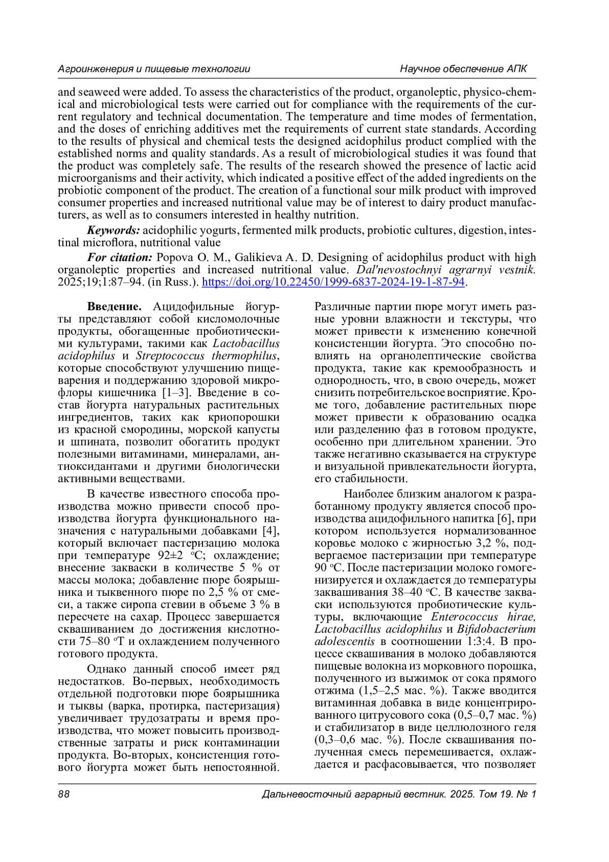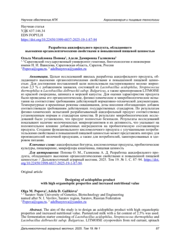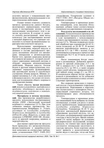 Целью исследований явилась разработка ацидофильного продукта, обладающего высокими органолептическими свойствами и повышенной пищевой ценностью. Для достижения поставленной цели использовали пастеризованное молоко жирностью 2,5 % с добавлением закваски, состоящей из Lactobacillus acidophilus, Streptococcus thermophilus и Lactobacillus delbrueckii subsp. Bulgaricus, а также криопорошков LITMOISE из красной смородины, шпината и морской капусты. Для оценки характеристик продукта были проведены его органолептические, физико-химические и микробиологические испытания на соответствие требованиям действующей нормативно-технической документации. Температурные и временные режимы сквашивания, дозы внесения обогащающих добавок соответствовали требованиям действующих государственных стандартов. По результатам физико-химических испытаний разрабатываемый ацидофильный продукт соответствовал установленным нормам и стандартам качества. В результате микробиологических исследований было установлено, что продукт полностью безопасен. Результаты исследований показывают наличие молочнокислых микроорганизмов и их активность, что указывает на положительное влияние добавленных ингредиентов на пробиотическую составляющую продукта. Создание функционального кисломолочного продукта с улучшенными потребительскими свойствами и повышенной пищевой ценностью может представлять интерес для производителей молочной продукции, а также для потребителей, заинтересованных в здоровом питании