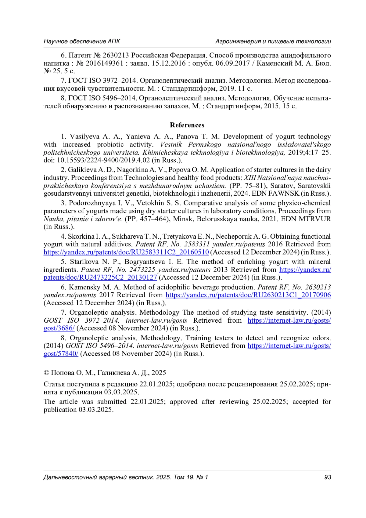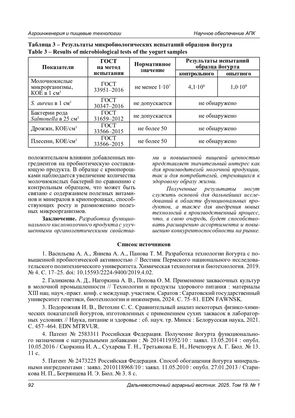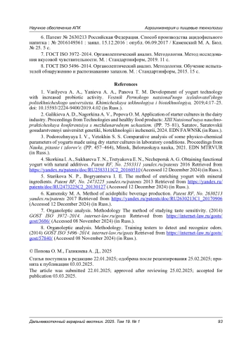 3. Подорожняя И. В., Ветохин С. С. Сравнительный анализ некоторых физико-химических показателей йогуртов, изготовленных с применением сухих заквасок в лабораторных условиях // Наука, питание и здоровье: сб. науч. тр. Минск: Белорусская наука, 2021. С. 457-464. EDN: MTRVUR