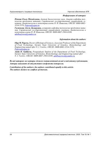 Проведены исследования по использованию в технологии песочного печенья урбеча из семян кунжута. В качестве жирового компонента при получении печенья традиционно используются сливочное масло или маргарин, которые характеризуются высоким содержанием насыщенных жирных кислот. Маргарин также содержит трансизомеры жирных кислот, способные отрицательно влиять на организм человека. Замена жирового компонента до 50,0 % урбечем из семян кунжута в рецептуре теста при получении песочного печенья позволила значительно снизить количество насыщенных жирных кислот в продукте. Урбеч - это протертая паста из семян кунжута, в которой содержание белков составляет 20,8 %, жира - 52,1 %, углеводов - 19,5 %, минеральных веществ - 4,8 %. В липидах урбеча из семян кунжута доли мононенасыщенных и полиненасыщенных жирных кислот составляют 42,92 % и 40,76 % соответственно от общей суммы липидов. Использование урбеча из семян кунжута в количестве 13,5 % от массы теста способствовало повышению в печенье содержания белков на 30,0 %, снижению жира на 19,0 %, а также насыщенных жирных кислот на 40,0 % и более. Замена одной второй части сливочного масла на урбеч в составе печенья обеспечило повышение в продукте полиненасыщенных жирных кислот с 0,8 до 3,9 г на 100 г продукта, при замене маргарина - на 16,0 %