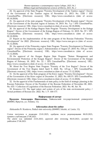 33. Краснова И.О. Правовая природа и система актов государственной экологической политики // Актуальные проблемы российского права. 2022. № 1. С. 164-177. EDN: EXICMQ