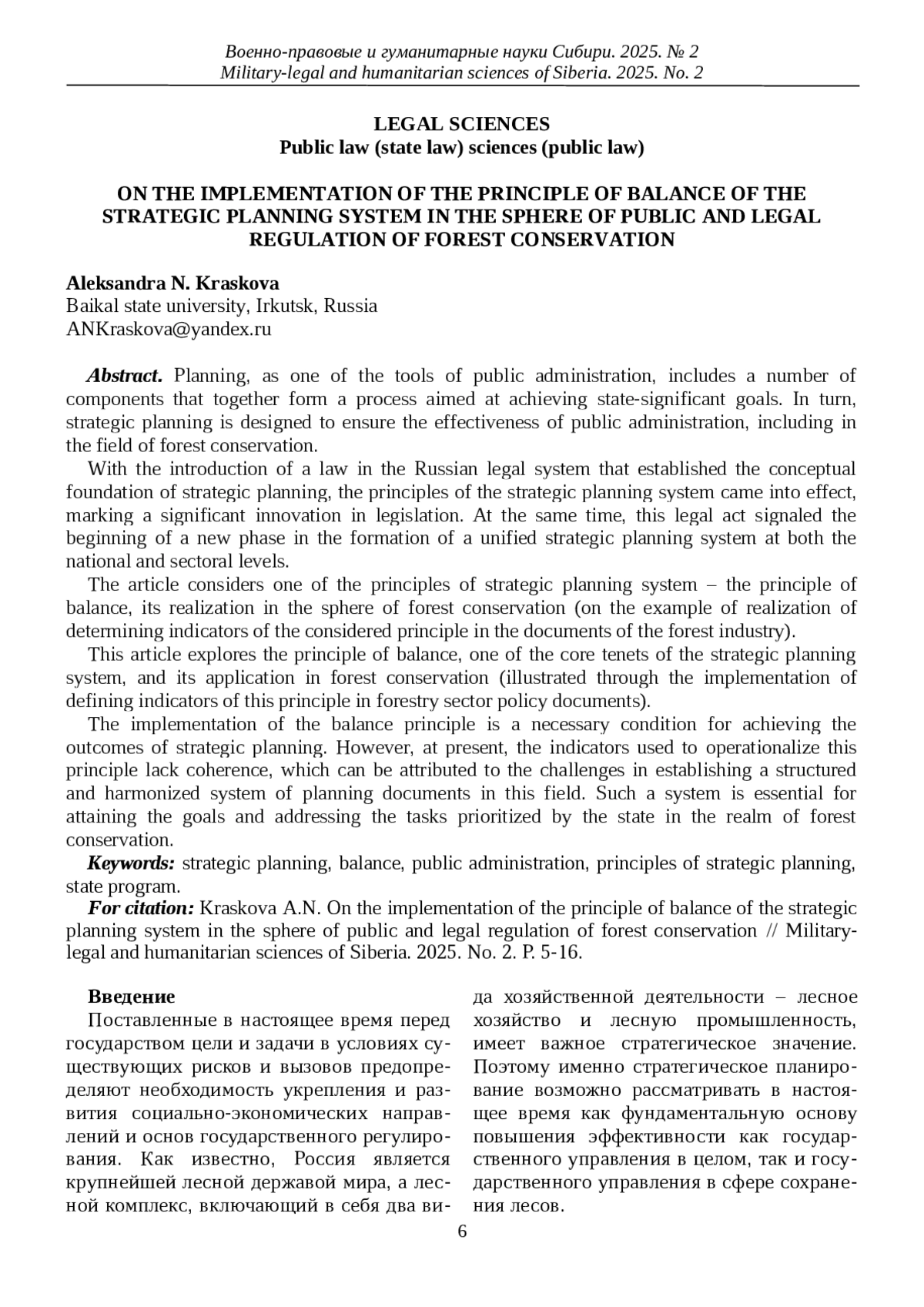 В статье рассмотрен один из принципов системы стратегического планирования - принцип сбалансированности, его реализация в сфере сохранения лесов (на примере реализации определяющих показателей рассматриваемого принципа в документах лесной отрасли).