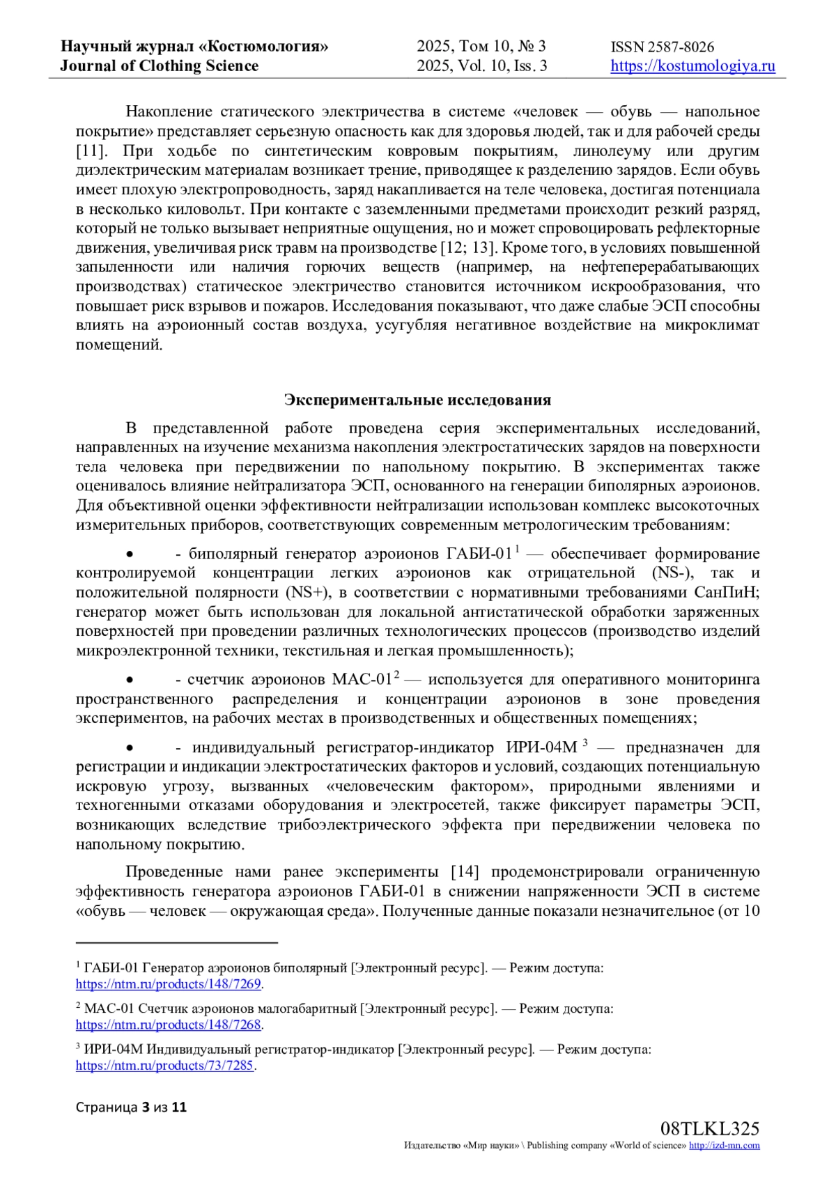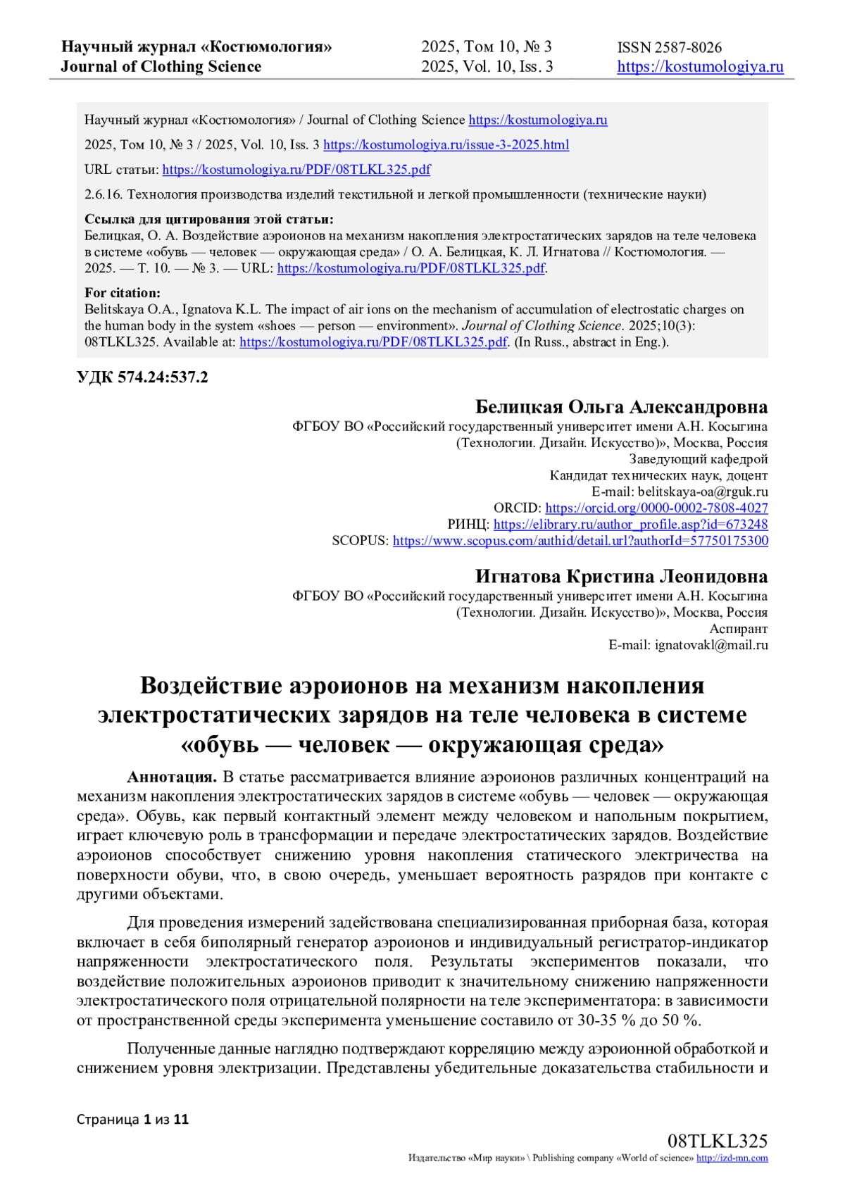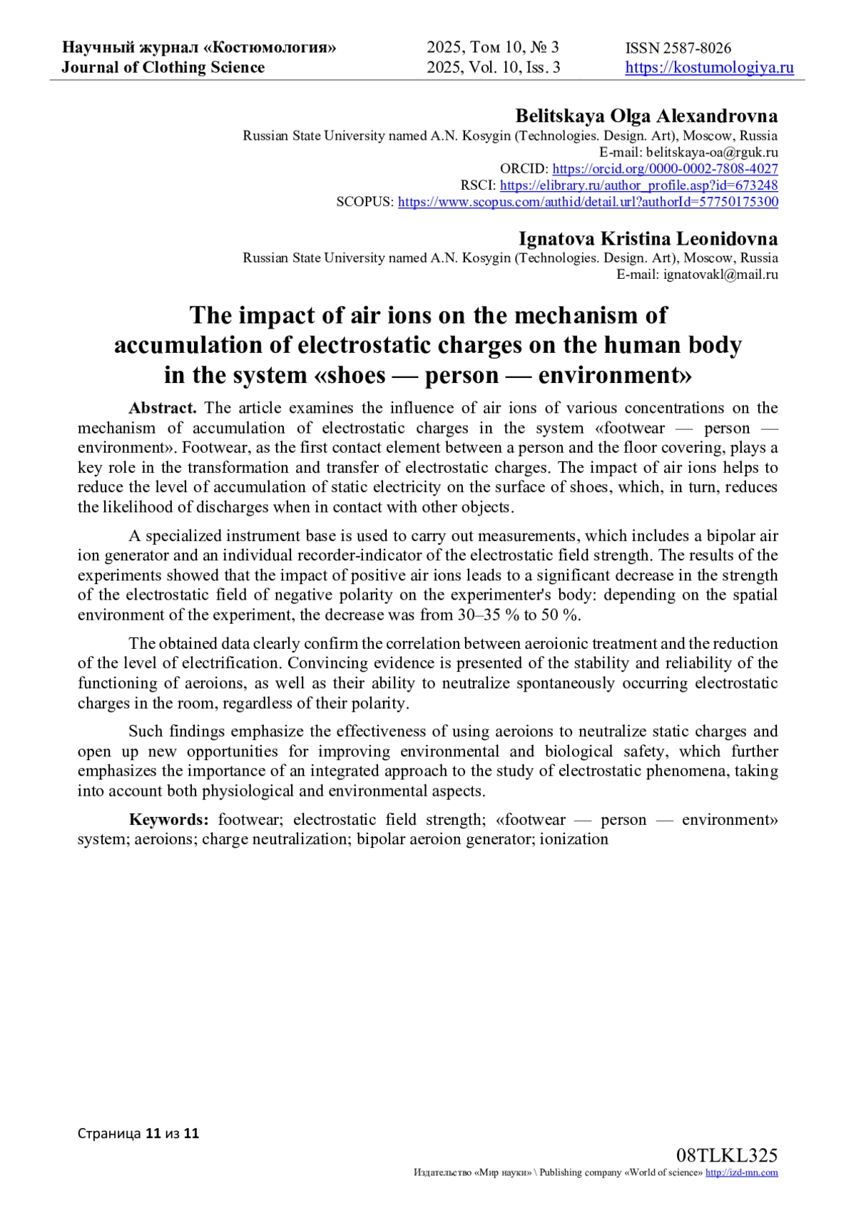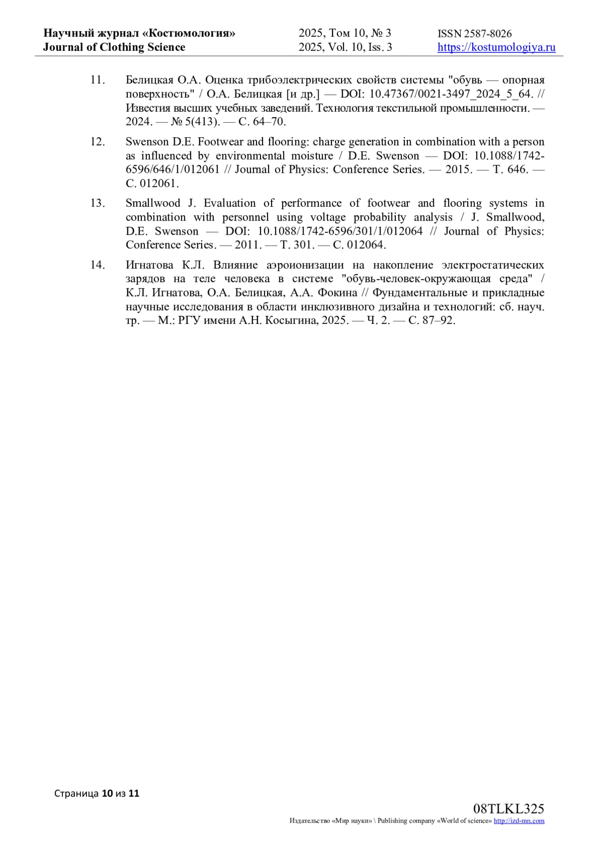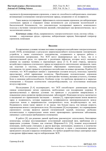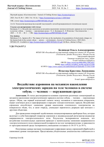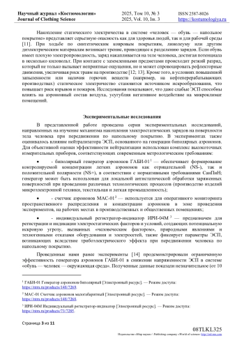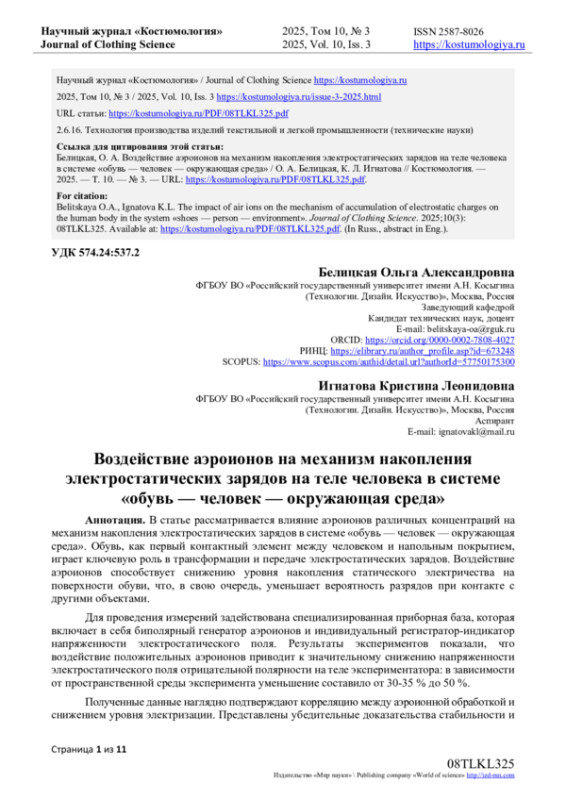14. Игнатова К.Л. Влияние аэроионизации на накопление электростатических зарядов на теле человека в системе “обувь-человек-окружающая среда” / К.Л. Игнатова, О.А. Белицкая, А.А. Фокина // Фундаментальные и прикладные научные исследования в области инклюзивного дизайна и технологий: сб. науч. тр. - М.: РГУ имени А.Н. Косыгина, 2025. - Ч. 2. - С. 87-92. EDN: CGWJKC