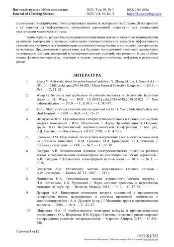 4. Игнатченко Ю.К. О взаимосвязи электростатического поля и аэроионного состава воздуха помещений / Ю.К. Игнатченко // Наука Промышленность Оборона: труды XXI Всероссийской научно-технической конференции / под ред. С.Д. Саленко. - Новосибирск: НГТУ, 2020. - С. 47-51.