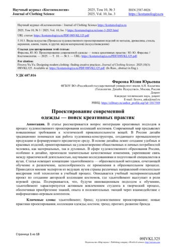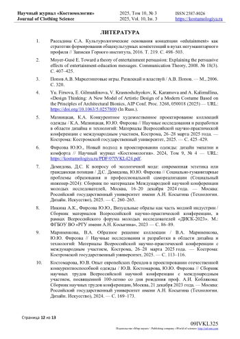 6. Фирсова Ю.Ю., Новый подход в проектировании одежды: дизайн эмпатии и комфорта // Научный журнал “Костюмология”. 2024, Том 9, № 4 - URL: https://kostumologiya.ru/PDF/07IVKL424.pdf.