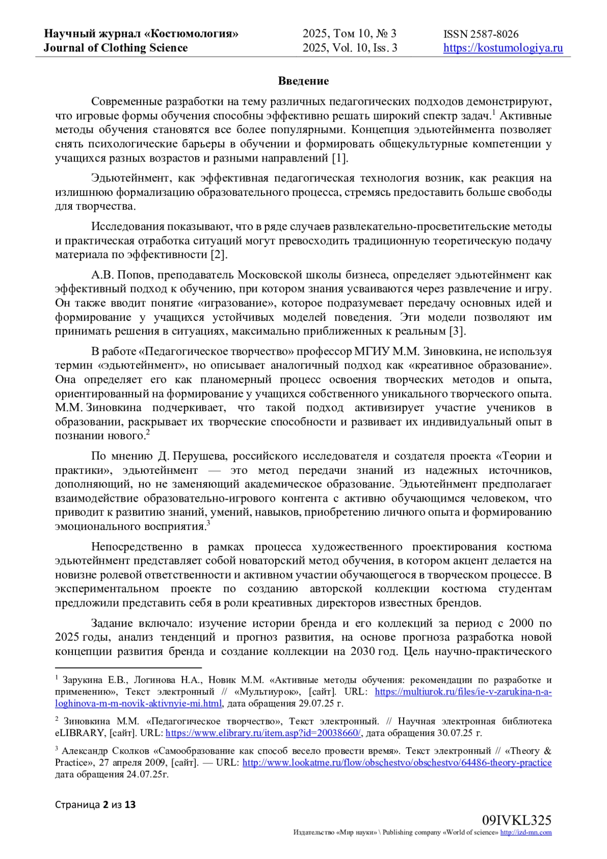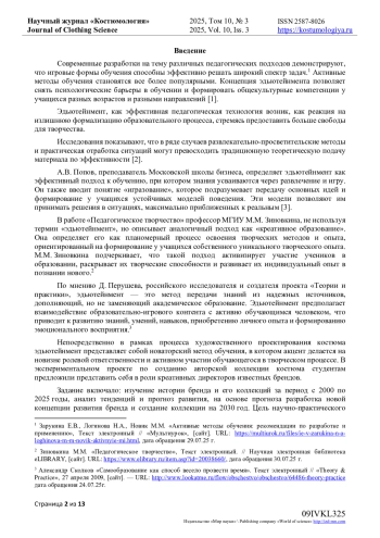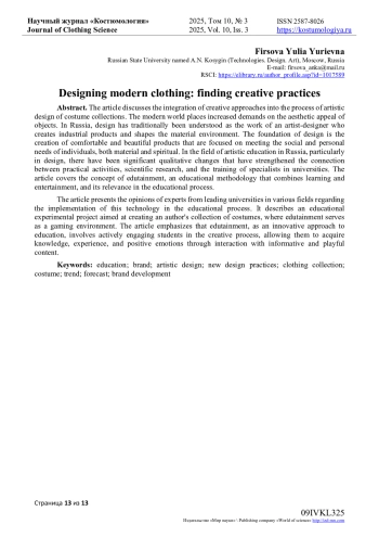 В статье рассматривается вопрос интеграции креативных подходов в процесс художественного проектирования коллекций костюмов. Современный мир предъявляет повышенные требования к эстетической привлекательности вещей. В России дизайн традиционно понимался как работа художника-конструктора, создающего промышленную продукцию и формирующего предметную среду. В основе дизайна лежит создание удобных и красивых изделий, ориентированных на удовлетворение общественных и личных потребностей человека, как материальных, так и духовных. В сфере художественного образования России, особенно в дизайне, произошли значительные качественные изменения, укрепившие связь между практической деятельностью, научными исследованиями и подготовкой специалистов в вузах. Статья освещает концепцию эдьютейнмента - образовательной методики, сочетающей обучение и развлечение, целесообразность ее применения в образовательном процессе. Приводятся мнения экспертов из ведущих вузов страны различных направлений относительно внедрения этой технологии в учебный процесс. Описывается учебный экспериментальный проект по созданию авторской коллекции костюмов, где эдьютейнмент выступает в роли игровой среды. Подчеркивается, что, будучи инновационным подходом к обучению, эдьютейнмент характеризуется активным вовлечением студента в творческий процесс, обеспечивая приобретение знаний, опыта и положительных эмоций через взаимодействие с информативно-игровым контентом.