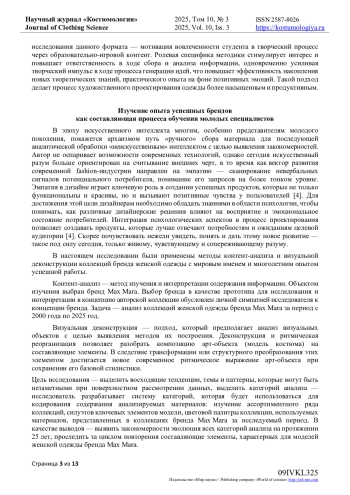 В настоящей статье рассматривается методика создания анимированных модных коллекций с использованием генеративной видеомодели Sora. Актуальность исследования обусловлена стремительным развитием технологий искусственного интеллекта, оказывающих значительное влияние на визуальные практики в сфере моды и дизайна. Современные дизайнеры всё чаще обращаются к цифровым форматам, где визуальное повествование становится ключевым элементом презентации. Предложенная методика позволяет создавать видеопрезентации коллекций без необходимости владения 3D-графикой или программированием. Основу процесса составляет работа с текстовыми описаниями образов, которые интерпретируются нейросетевой моделью и преобразуются в анимированные сцены. Описаны этапы работы: от анализа визуальных референсов и формулировки текстовых промтов - до генерации видео и видеомонтажа. Методика апробирована на реальной цифровой коллекции и показала свою применимость как в профессиональной деятельности, так и в образовательной среде. Особое внимание уделено ограничениям: субъективности интерпретации текстов моделью и зависимости от качественного описания. Результаты исследования демонстрируют потенциал генеративных моделей в области цифровой моды и расширяют инструментарий визуального дизайнера в условиях перехода к постфизическим форматам представления одежды. Разработанный алгоритм продемонстрировал, как цифровую модную коллекцию можно оперативно превратить в визуально выразительный анимированный показ без обращения к трудоёмким 3D-пакетам. Перевод статичных визуальных образов в текстовые описания упрощает итерационный процесс и позволяет сосредоточиться на художественных аспектах, а не на технической рутине.