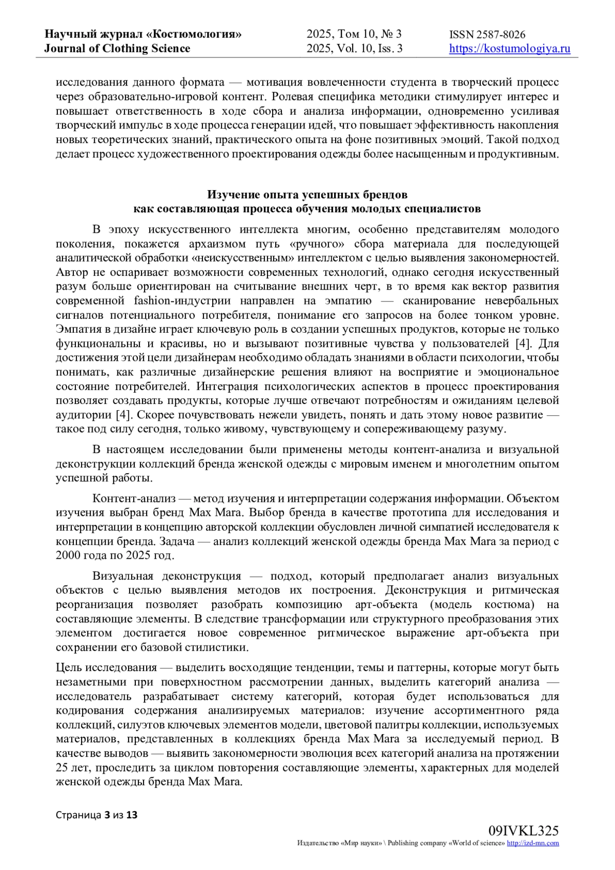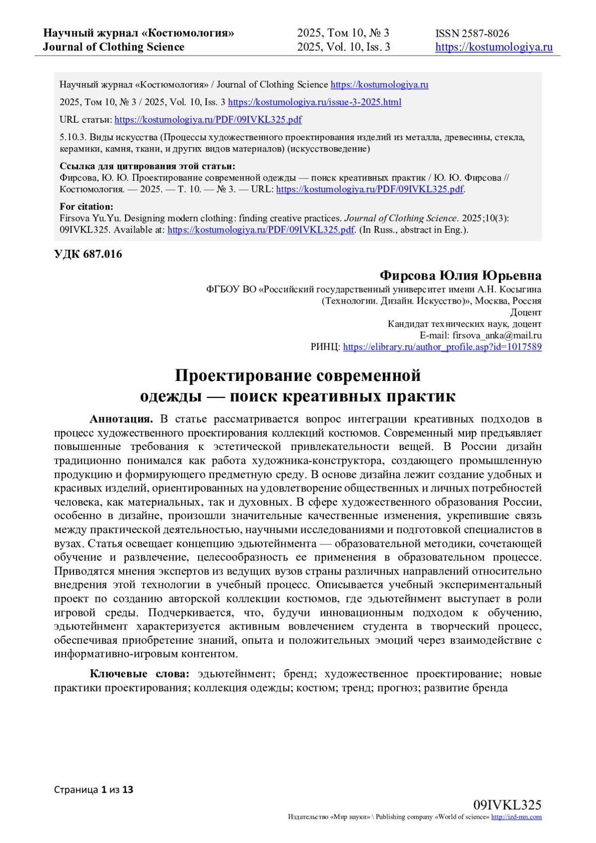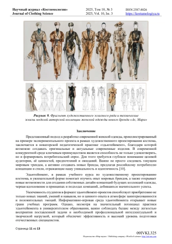 9. Мариненкова, В.А. Образное решение коллекции / В.А. Мариненкова, Ю.Ю. Фирсова // Научные исследования и разработки в области дизайна и технологий: Материалы Всероссийской научно-практической конференции с международным участием, Кострома, 26-28 марта 2025 года. - Кострома: Костромской государственный университет, 2025. - С. 113-116. EDN: BYQOPO