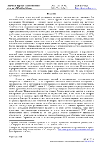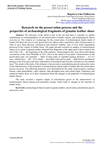 Актуальность статьи обусловлена, тем что в настоящее время не существует единой методики или рекомендаций для работ по сохранению объектов из кожи, а археологических объектов тем более. Создание технологии консервации археологических объектов из кожи позволит применять новый консервант к предметам с удовлетворительным состоянием сохранности, для придания им физико-механической и химической устойчивости, остановке или замедления деградационных процессов в объеме кожевой ткани. В работе представлены исследования образцов археологических объектов (а. о.) из натуральной кожи полученных из фрагментов верха обуви с датировкой конец XVII - начало XVIII веков. Археологические объекты обнаружены при раскопках «Татарской Слободки» в 2011-2014 гг. о. Свияжск. Характеристики состояния сохранности: сырье - шкуры крупнорогатого скота растительного дубления; толщина - 0,2-0,3 мм; культурный слой - рН > 40 %; деталь - голенище обуви; цвет неравномерный (темно-светло-коричневый); механические повреждения лицевого слоя и бахтармы; деформации бытовые и от залегания в культурном слое. Приведены результаты исследования влияния консервантов (полиэтиленгликолей и акриловой смолы) на характеристики свойств археологических объектов из кожи после процесса консервации. Для исследования определили: гигроскопичность, влагоотдачу, паропроницаемость, пароемкость, время впитывания капли, краевой угол смачивания. Лабораторные и аналитические исследования позволяют сделать выводы о изменении характеристик свойств археологических объектов из кожи. Выявлено негативное влияние полиэтиленгликоля на характеристики археологических объектов в период постреставрационного хранения, которое приводит к изменениям структуры кожевой ткани.