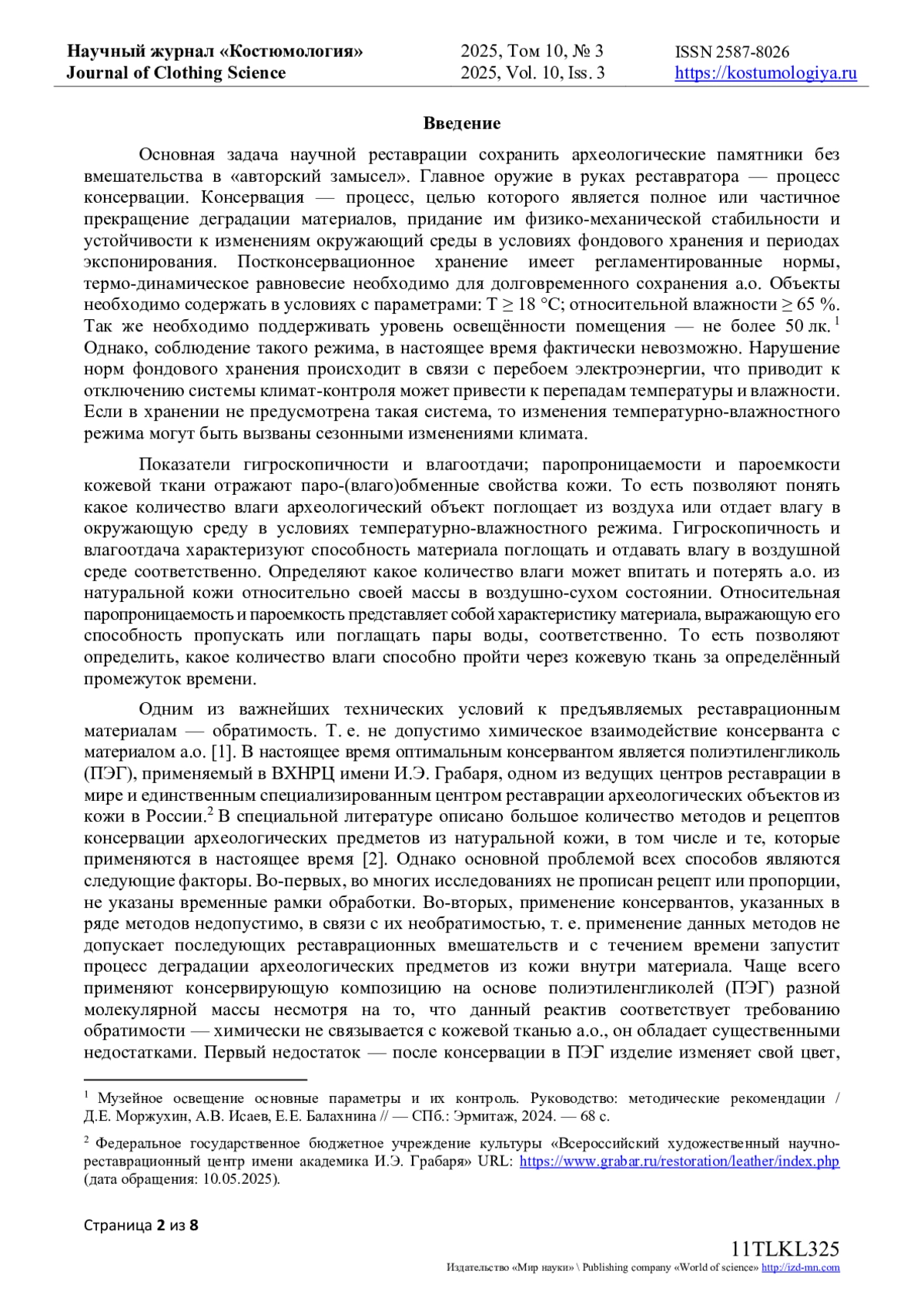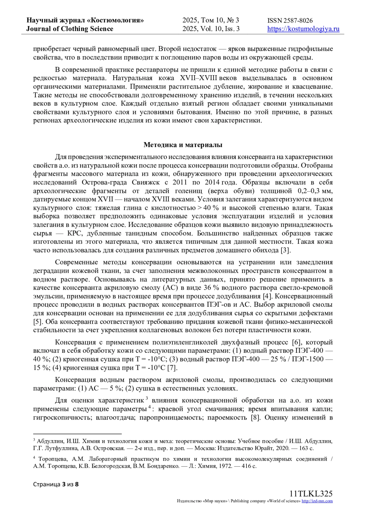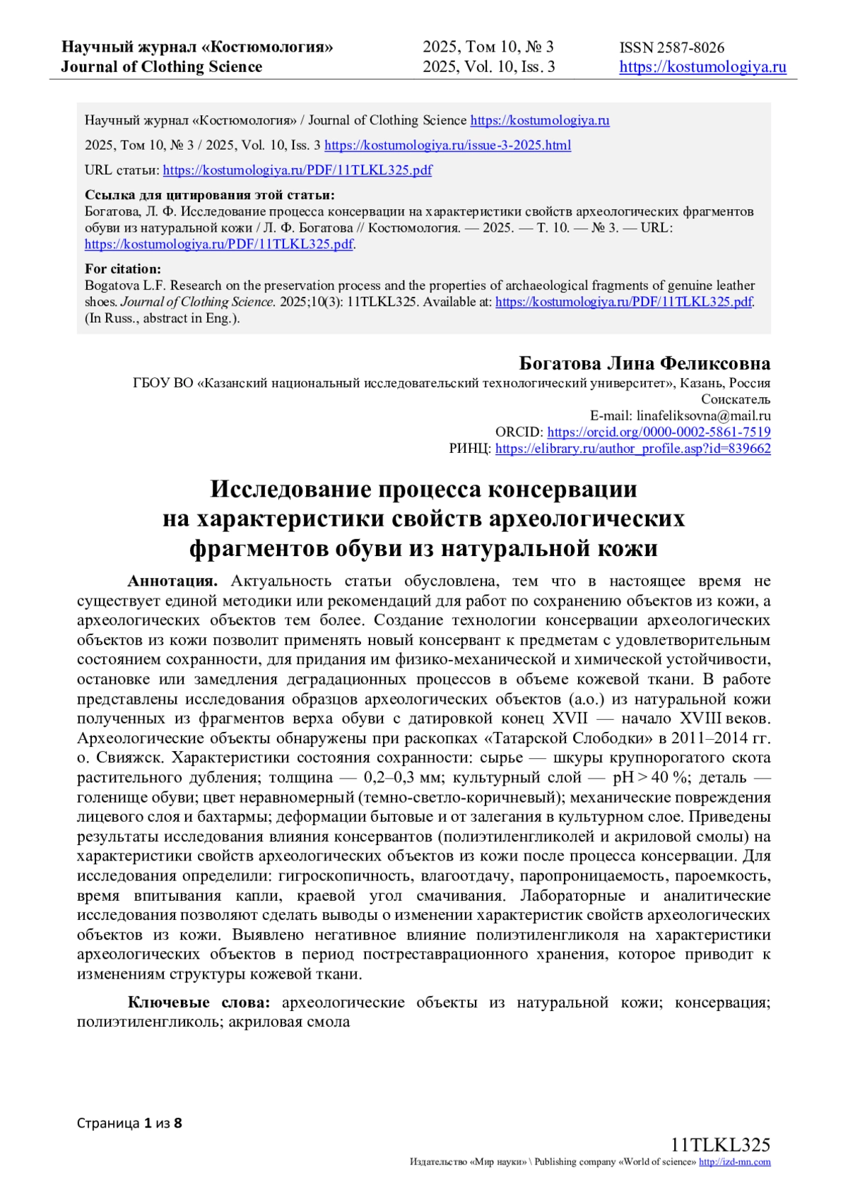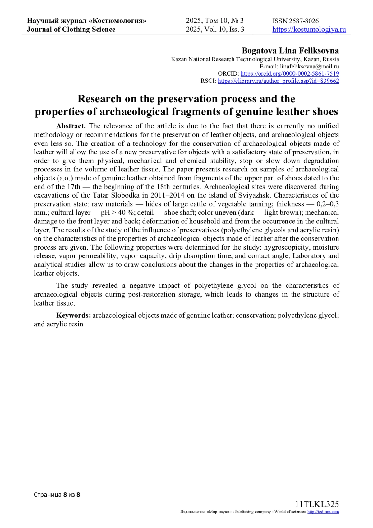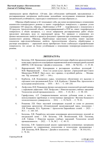 7. Богатова, Л.Ф. Разработка методики консервации археологических изделий из натуральной кожи / Л.Ф. Богатова, Э.Ф. Вознесенский, Н.В. Тихонова, А.Ф. Гайсин // Известия высших учебных заведений. Технология легкой промышленности. - 2022. - Т. 56, № 2. - С. 48-51. EDN: YKTOZL