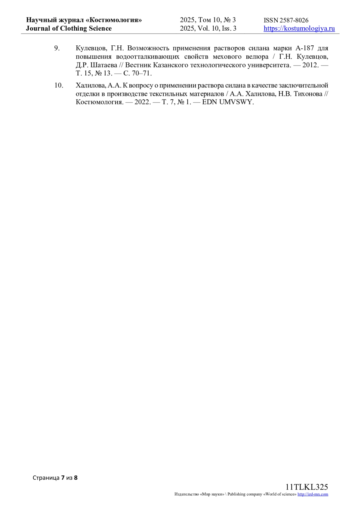 10. Халилова, А.А. К вопросу о применении раствора силана в качестве заключительной отделки в производстве текстильных материалов / А.А. Халилова, Н.В. Тихонова // Костюмология. - 2022. - Т. 7, № 1. EDN: UMVSWY