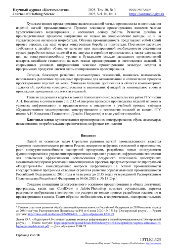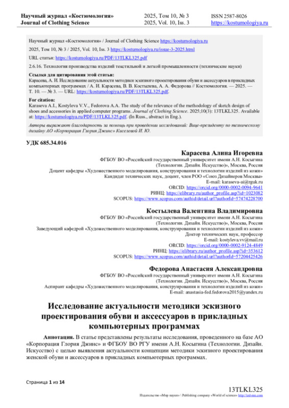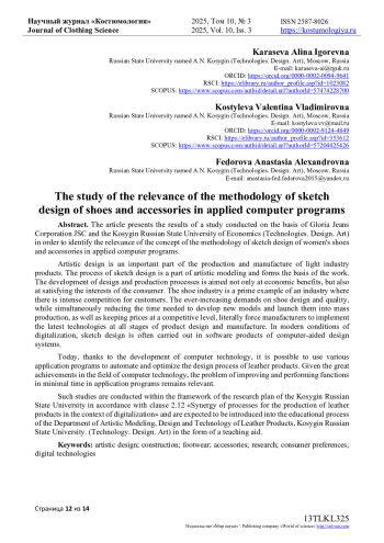 В статье представлены результаты исследования, проведенного на базе АО «Корпорация Глория Джинс» и ФГБОУ ВО РГУ имени А. Н. Косыгина (Технологии. Дизайн. Искусство) с целью выявления актуальности концепции методики эскизного проектирования женской обуви и аксессуаров в прикладных компьютерных программах. Художественное проектирование является важной частью производства и изготовления изделий легкой промышленности. Процесс эскизного проектирования является частью художественного моделирования и составляет основу работы. Развитие дизайна и производственных процессов направлено не только на экономические выгоды, но и на удовлетворение интересов потребителя. Обувная промышленность представляет собой яркий пример отрасли, где идет острая конкурентная борьба за покупателя. Постоянно растущие требования к дизайну обуви, ее качеству при одновременной необходимости сокращения сроков разработки новых моделей и их запуска в серийное производство, а также удержания цен на конкурентоспособном уровне в буквальном смысле заставляют производителей внедрять новейшие технологии на всех этапах проектирования и изготовления изделий. В современных условиях цифровизации эскизное проектирование зачастую ведется в программных продуктах систем автоматизированного проектирования. Сегодня, благодаря развитию компьютерных технологий, появилась возможность использовать различные прикладные программы для автоматизации и оптимизации процесса проектирования изделий из кожи. Учитывая большие достижения в области компьютерных технологий, проблема совершенствования и выполнения функций за минимальное время в прикладных программах остается актуальной. Такие исследования ведутся в рамках плана научно-исследовательских работ РГУ имени А. Н. Косыгина в соответствии с п. 2.12 «Синергия процессов производства изделий из кожи в условиях цифровизации» и предполагаются к внедрению в учебный процесс кафедры «Художественное моделирование, конструирование и технология изделий из кожи», РГУ имени А. Н. Косыгина (Технологии. Дизайн. Искусство) в виде учебного пособия.