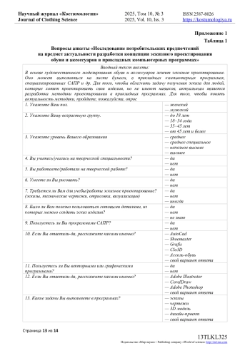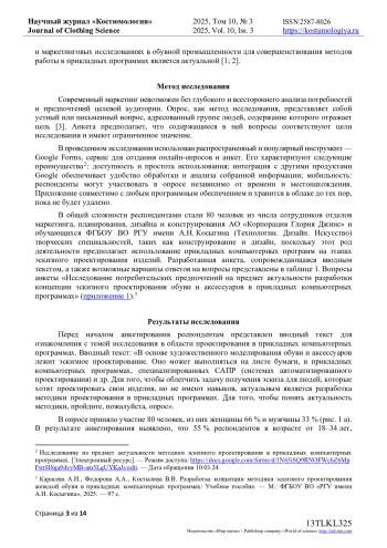 Цель исследования состоит в сборе и последующем анализе данных, позволяющих выявить реальные ожидания потребителей перед началом зимнего сезона 2025/26 годов. Научная работа проводилась в рамках изучения меха как материала, широко используемого отечественными производителями модной одежды различного ассортимента и назначения. Мех («мягкое золото») традиционно считается уникальным природным богатством России. В XVI веке он служил символом высокого статуса в российском обществе, олицетворяя богатство и процветание. Дорогостоящие соболиные меха были неотъемлемой частью древнерусских свадебных церемоний. Исследование основано на социальном опросе - анкете, направленной на выявление потребительских предпочтений относительно выбора верхней зимней одежды из меха. Опрос-анкетирование составлено автором и включает 18 вопросов. В анкетировании принимали участие жители Москвы, в том числе обучающаяся молодежь творческих специальностей: художники, дизайнеры (приложение 1). В ходе исследования были поставлены следующие задачи: выявить актуальность использования меха в производстве верхней одежды. Определить предпочтения потребителей относительно ассортимента верхней одежды. установить предпочтения в выборе между искусственным и натуральным мехом. Изучить предпочтения покупателей по видам меховых полуфабрикатов, способам их декорирования, длине, цветовой гамме, стилю, применению инновационных материалов, декоративных элементов и фурнитуры. Эти данные необходимы для формирования основополагающих характеристик, позволяющих дизайнерам разрабатывать качественные и востребованные продукты. Современные инновационные технологии обеспечивают создание высококачественного мехового сырья. Анализ эстетической привлекательности меха и изучение потребительских предпочтений позволят проектировать конкурентоспособную верхнюю одежду и создавать оригинальные дизайнерские коллекции.