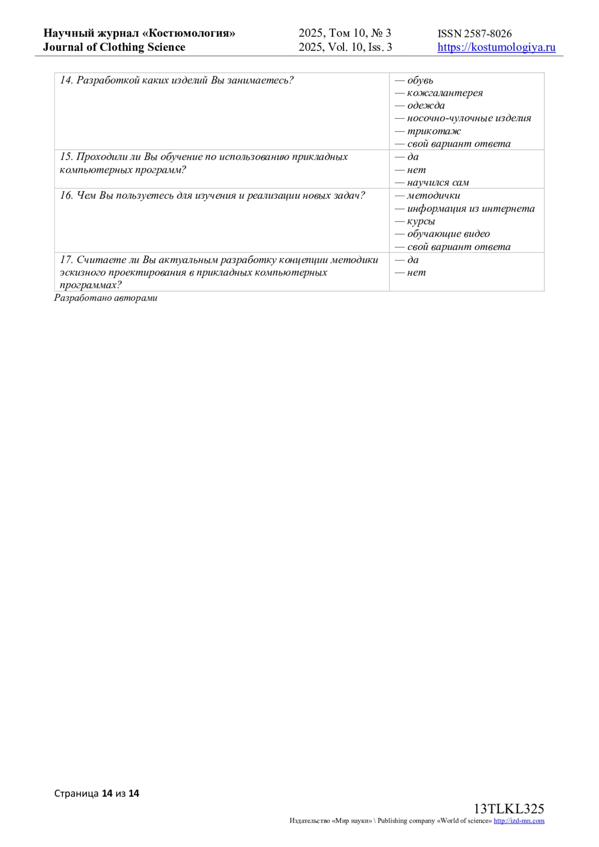 7. Карасева, А.И. Художественное проектирование и разработка конструкций детских изделий гардероба с использованием современных цифровых технологий / А.И. Карасева, В.В. Костылева, Е.В. Кисилев [и др.] // Костюмология. - 2023. - Т 8. - № 2. - URL: https://kostumologiya.ru/PDF/08TLKL223.pdf. - 10.15862/08TLKL223. (дата обращения: 20.08.2025). DOI: 10.15862/08TLKL223.( EDN: RZFKZI