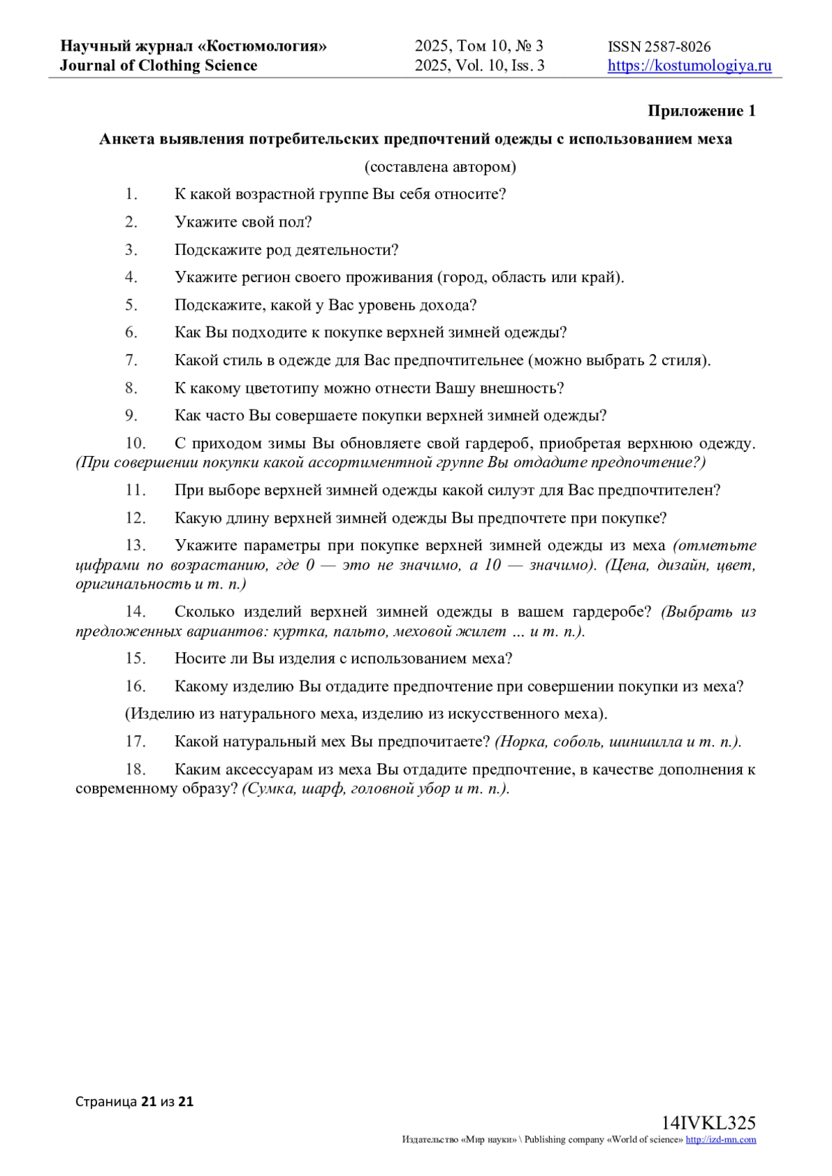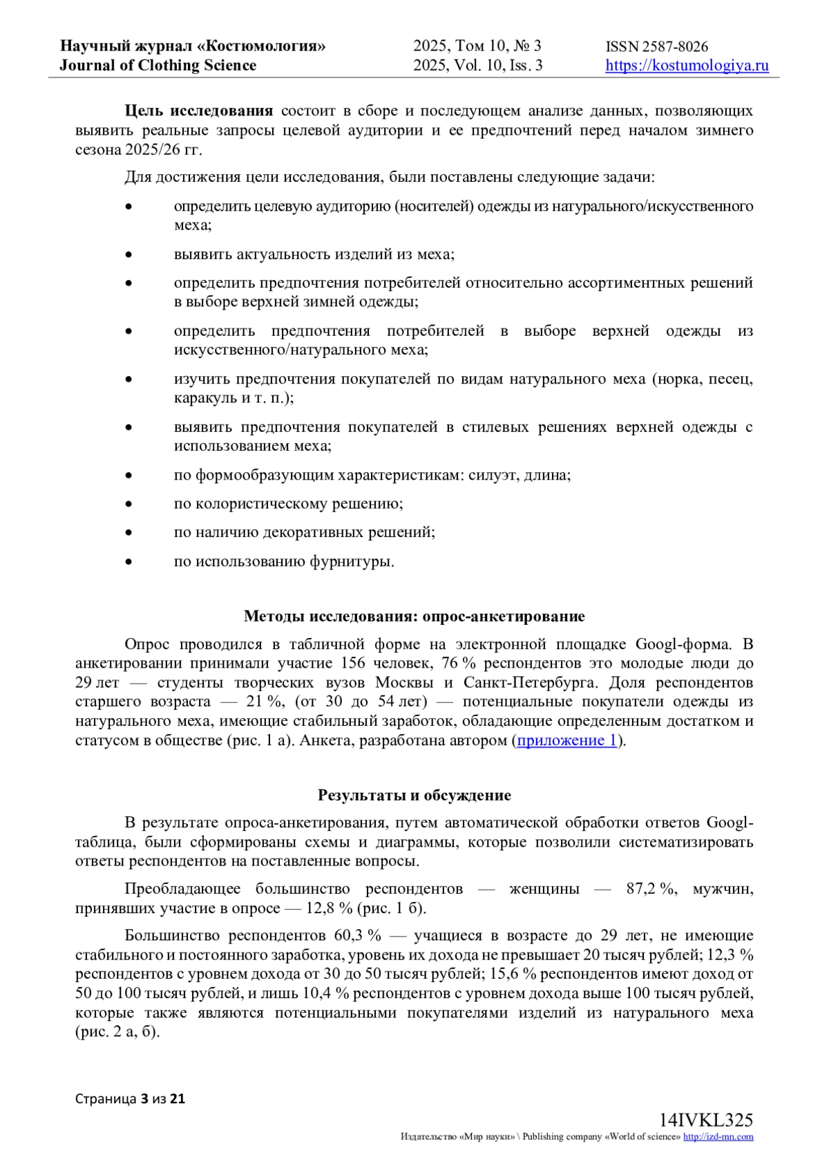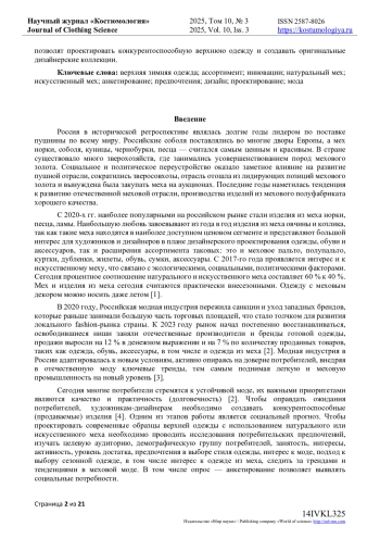 Цель исследования состоит в сборе и последующем анализе данных, позволяющих выявить реальные ожидания потребителей перед началом зимнего сезона 2025/26 годов. Научная работа проводилась в рамках изучения меха как материала, широко используемого отечественными производителями модной одежды различного ассортимента и назначения. Мех («мягкое золото») традиционно считается уникальным природным богатством России. В XVI веке он служил символом высокого статуса в российском обществе, олицетворяя богатство и процветание. Дорогостоящие соболиные меха были неотъемлемой частью древнерусских свадебных церемоний. Исследование основано на социальном опросе - анкете, направленной на выявление потребительских предпочтений относительно выбора верхней зимней одежды из меха. Опрос-анкетирование составлено автором и включает 18 вопросов. В анкетировании принимали участие жители Москвы, в том числе обучающаяся молодежь творческих специальностей: художники, дизайнеры (приложение 1). В ходе исследования были поставлены следующие задачи: выявить актуальность использования меха в производстве верхней одежды. Определить предпочтения потребителей относительно ассортимента верхней одежды. установить предпочтения в выборе между искусственным и натуральным мехом. Изучить предпочтения покупателей по видам меховых полуфабрикатов, способам их декорирования, длине, цветовой гамме, стилю, применению инновационных материалов, декоративных элементов и фурнитуры. Эти данные необходимы для формирования основополагающих характеристик, позволяющих дизайнерам разрабатывать качественные и востребованные продукты. Современные инновационные технологии обеспечивают создание высококачественного мехового сырья. Анализ эстетической привлекательности меха и изучение потребительских предпочтений позволят проектировать конкурентоспособную верхнюю одежду и создавать оригинальные дизайнерские коллекции.
